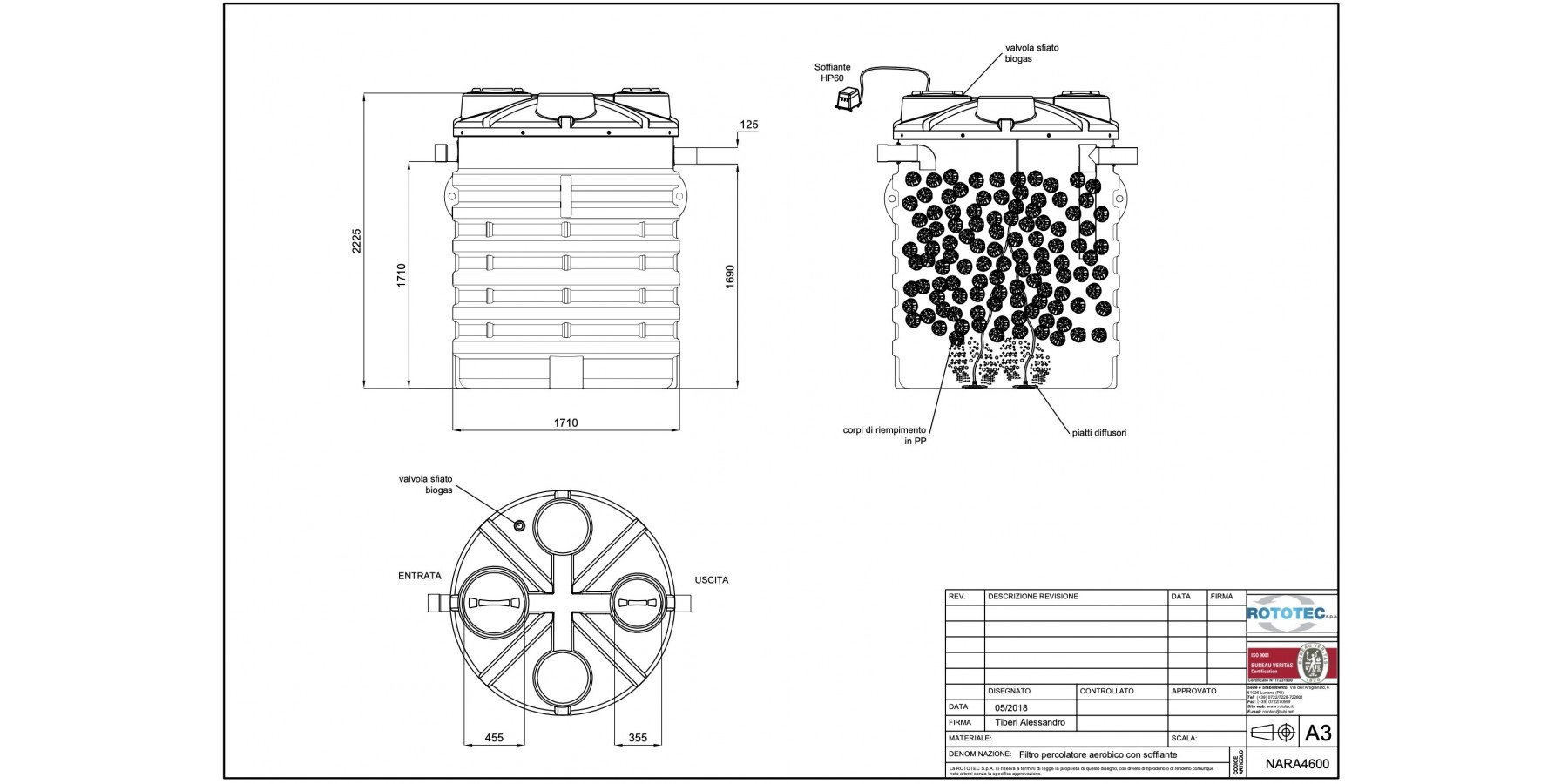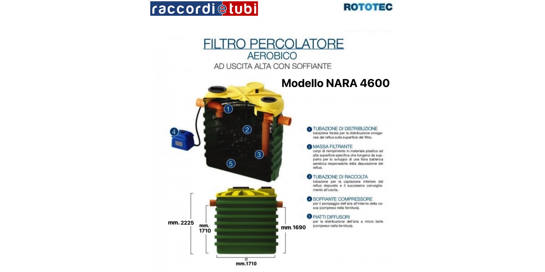 Der Perkolatorfilter ist ein biologischer Reaktor, in dem sich Mikroorganismen entwickeln, die die Abwasserreinigung übernehmen, und zwar auf der Oberfläche spezieller, lose angeordneter Füllkörper. Die gleichmäßige Verteilung der Lauge durch den Filter garantiert den maximalen Kontakt zwischen dem zu zersetzenden organischen Material und den biologischen Filmen, die die Füllkugeln bedecken. Konkret verbraucht die Bakterienflora, die sich im Perkolatorfilter mit hohem Ausgang entwickelt und wächst, die organische Belastung im Abwasser in Gegenwart von Sauerstoff, der kontinuierlich durch einen externen Kompressor in das Becken eingeblasen und durch Diffusorplatten verteilt wird. Die aerobischen Perkolatorfilter mit hohem Ausgang und Gebläse werden als Sekundärbehandlung für häusliche oder vergleichbare Abwässer eingesetzt. Vorausgesetzt eine Entfettungsphase und eine primäre Sedimentationsphase (Imhoff-Becken oder Klärgrube) werden vorangestellt, kann das behandelte Abwasser in unterirdische Versickerungsanlagen oder in Oberflächengewässer eingeleitet werden.