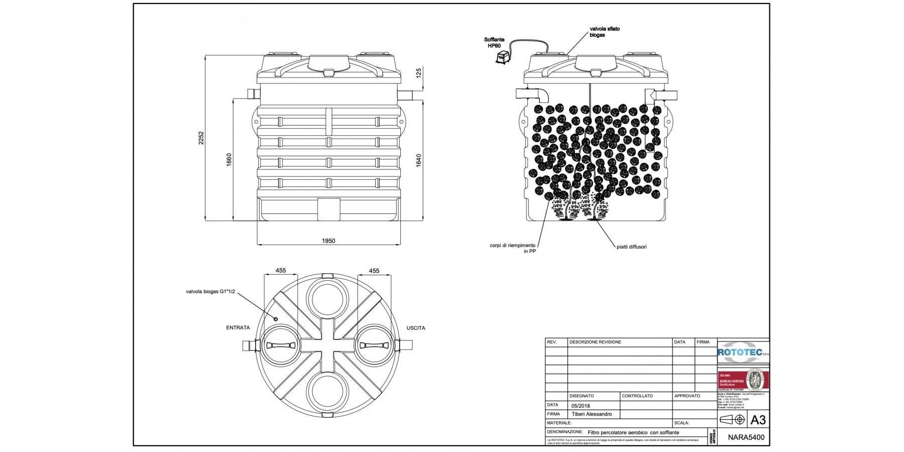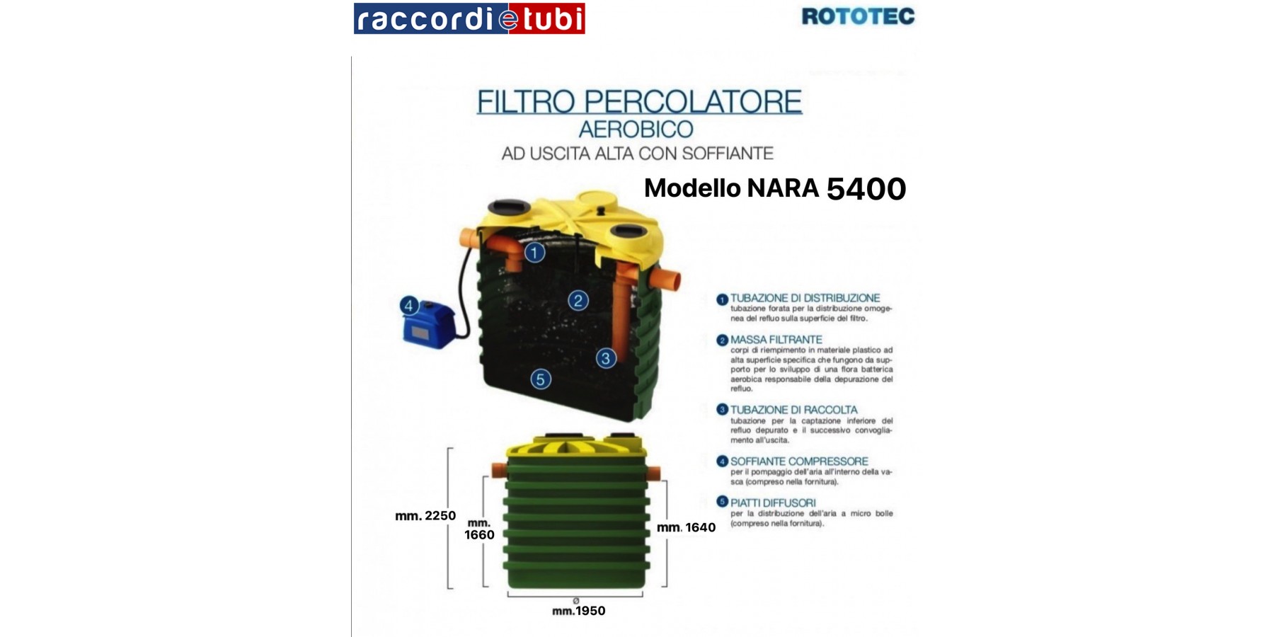 Der Perkolatorfilter ist ein biologischer Reaktor, in dem sich die Mikroorganismen, die die Abwasserreinigung durchführen, auf der Oberfläche spezieller, ungeordnet angeordneter Füllkörper entwickeln. Die gleichmäßige Verteilung der Flüssigkeit durch den Filter gewährleistet den maximalen Kontakt zwischen dem abzubauenden organischen Material und den Biofilmen, die die Füllkugeln bedecken. Konkret verbraucht die Bakterienflora, die im aeroben Perkolatorfilter mit hohem Austritt wächst und sich entwickelt, die im Abwasser enthaltene organische Last in Gegenwart von Sauerstoff, der über einen externen Kompressor kontinuierlich in das Becken eingebracht und durch Verteilplatten verteilt wird. Aerobe Perkolatorfilter mit hohem Austritt und Gebläse werden als Zweitbehandlung von häuslichem oder ähnlich behandeltem Abwasser eingesetzt. Sie müssen von einer Entfettungs- und einer primären Sedimentationsphase (Imhoff-Becken oder Klärgrube) vorausgegangen sein, damit das behandelte Abwasser in unterirdische Versickerungsanlagen oder in oberirdische Gewässer eingeleitet werden kann.