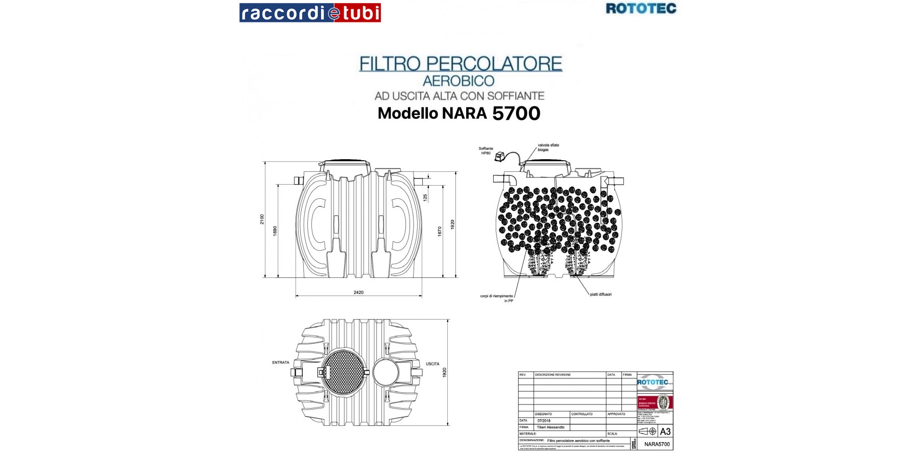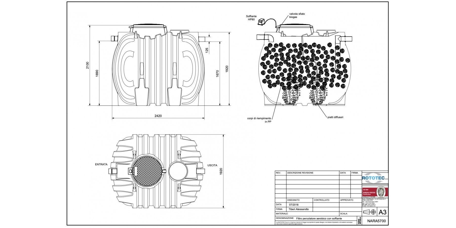 Der Perkolatorfilter ist ein biologischer Reaktor, in dem sich Mikroorganismen, die das Abwasser reinigen, auf der Oberfläche spezieller, locker angeordneter Füllkörper entwickeln. Die gleichmäßige Verteilung der Flüssigkeit durch den Filter gewährleistet den maximalen Kontakt zwischen dem zu zersetzenden organischen Material und den biologischen Filmen, die die Füllkugeln bedecken. Speziell verbraucht die Bakterienflora, die im Perkolatorfilter mit hohem Ausgang wächst und sich entwickelt, die im Abwasser enthaltene organische Last in Anwesenheit von Sauerstoff, der kontinuierlich durch den externen Kompressor in das Becken eingebracht und von den Verteilplatten verteilt wird. Perkolatorfilter mit hohem Ausgang und Gebläse werden als sekundäre Behandlung für häusliches oder vergleichbares Abwasser eingesetzt. Sie müssen von einer Entfettungsphase und einer primären Sedimentationsphase (Imhoff-Becken oder Faulbehälter) vorgeschaltet werden, so dass das behandelte Abwasser in das Grundwasser oder einen Oberflächenwasserlauf eingeleitet werden kann.