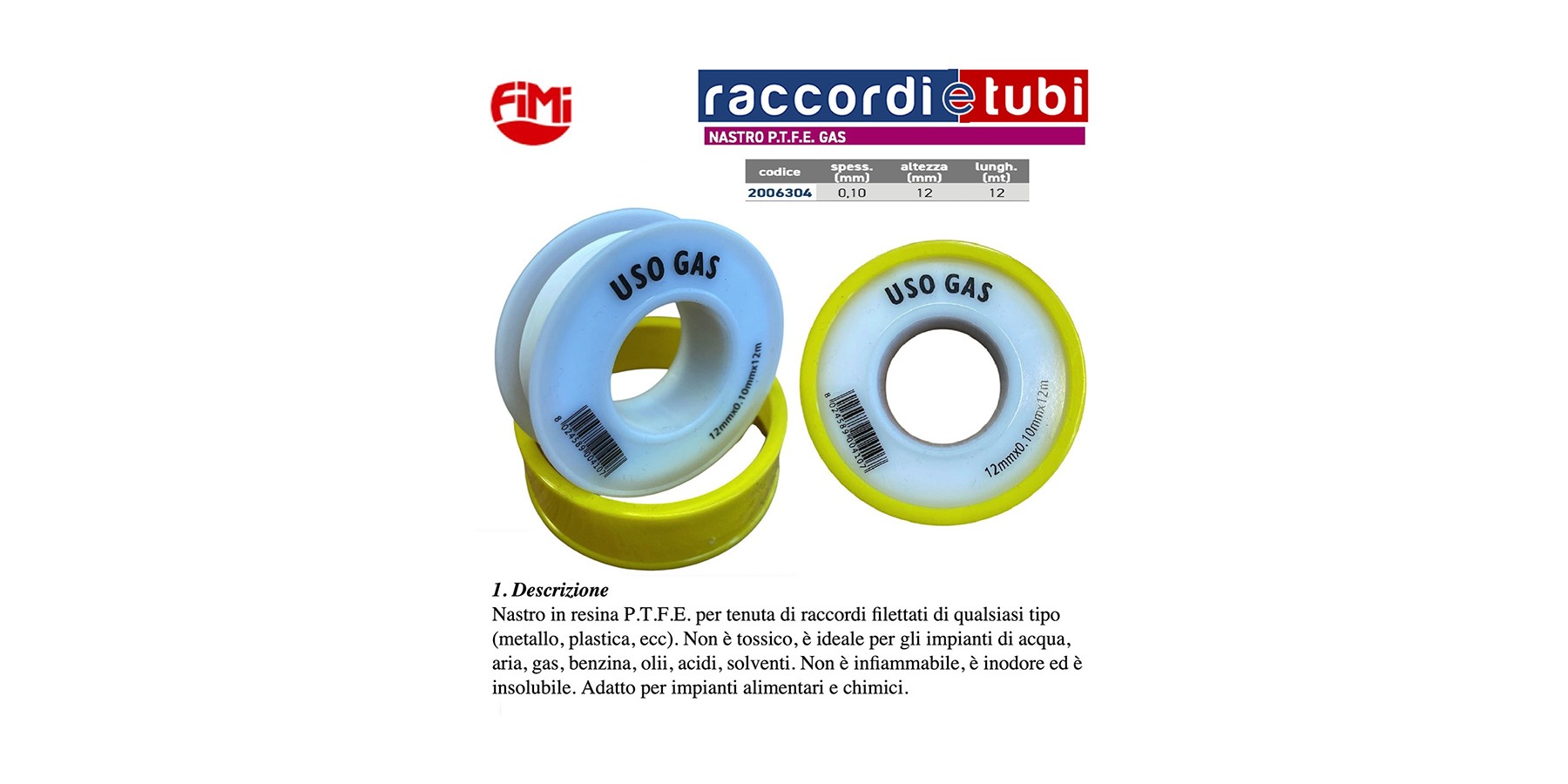PTFE-Dichtungsband aus Harz zur Abdichtung von Gewindeverbindungen jeglicher Art (Metall, Kunststoff usw.). Es ist ungiftig, ideal für Wasser-, Luft-, Gas-, Benzin-, Öl-, Säure- und Lösungsmittelanlagen. Es ist nicht brennbar, geruchlos und unlöslich. Geeignet für Lebensmittel- und Chemieanlagen.
