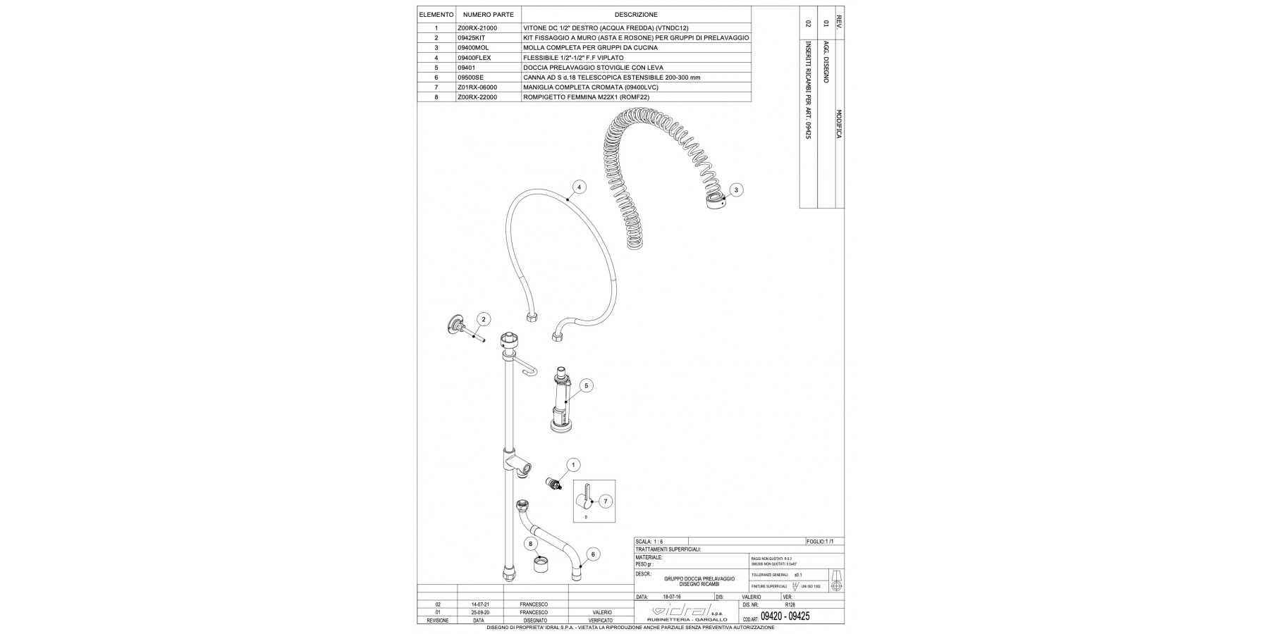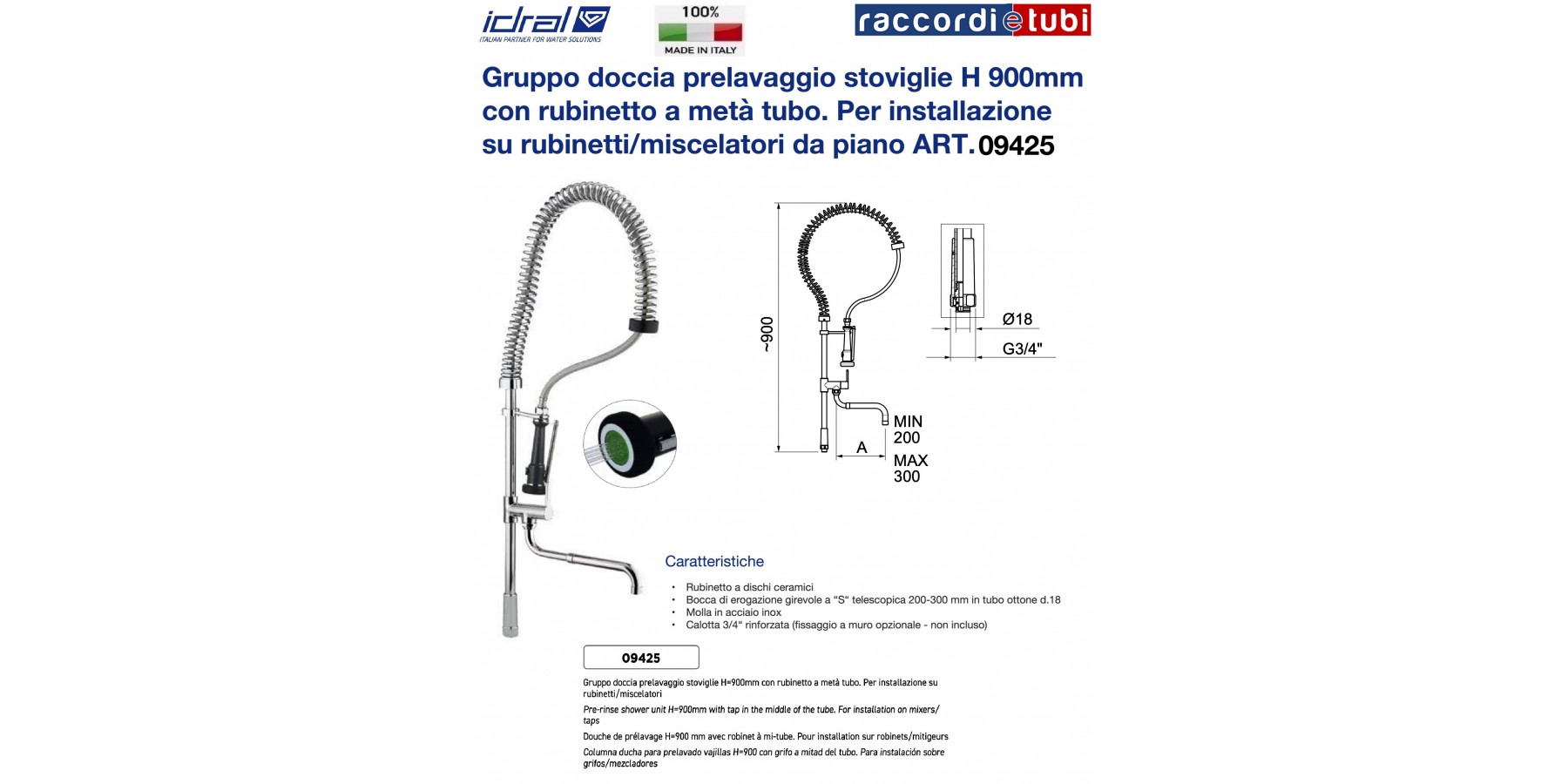 Die Vorwaschduschgruppe für Geschirr H=900mm mit Mittelrohr-Hahn, Modell 09425 von Idral, ist die ideale Lösung für die Installation an Armaturen oder Einhandmischern auf der Arbeitsplatte. Ausgestattet mit einem Keramikscheiben-Hahn verfügt sie über einen schwenkbaren Auslauf in „S“-Form, teleskopisch (200-300 mm) aus 18 mm Messingrohr, für eine präzise Wasserflusskontrolle. Die Edelstahldruckfeder garantiert Widerstandsfähigkeit und lange Lebensdauer, während die verstärkte 3/4" Kappe eine optionale Wandbefestigung ermöglicht (nicht enthalten). Perfekt für den professionellen Einsatz in Küchen und Industriewaschbecken.