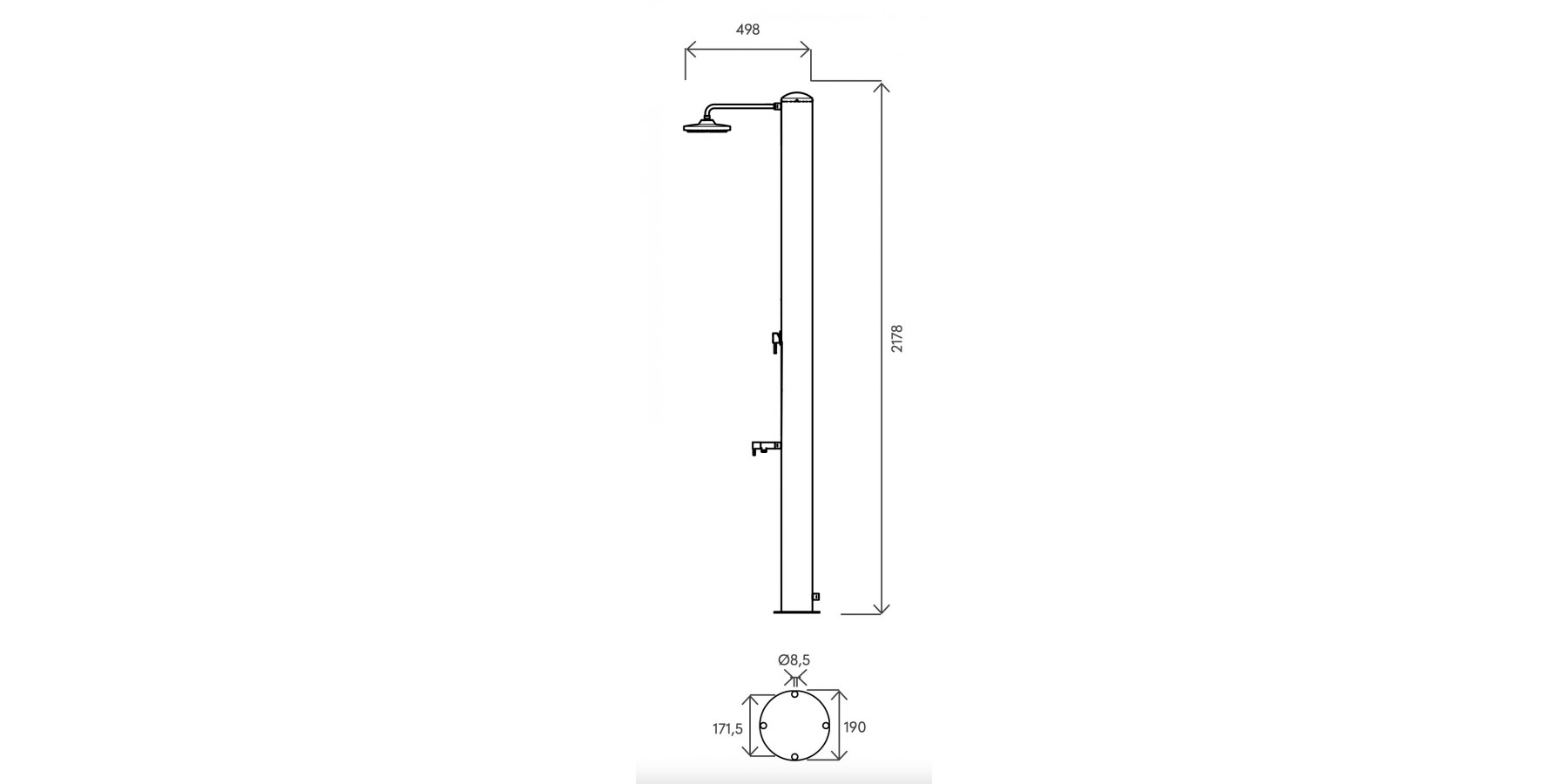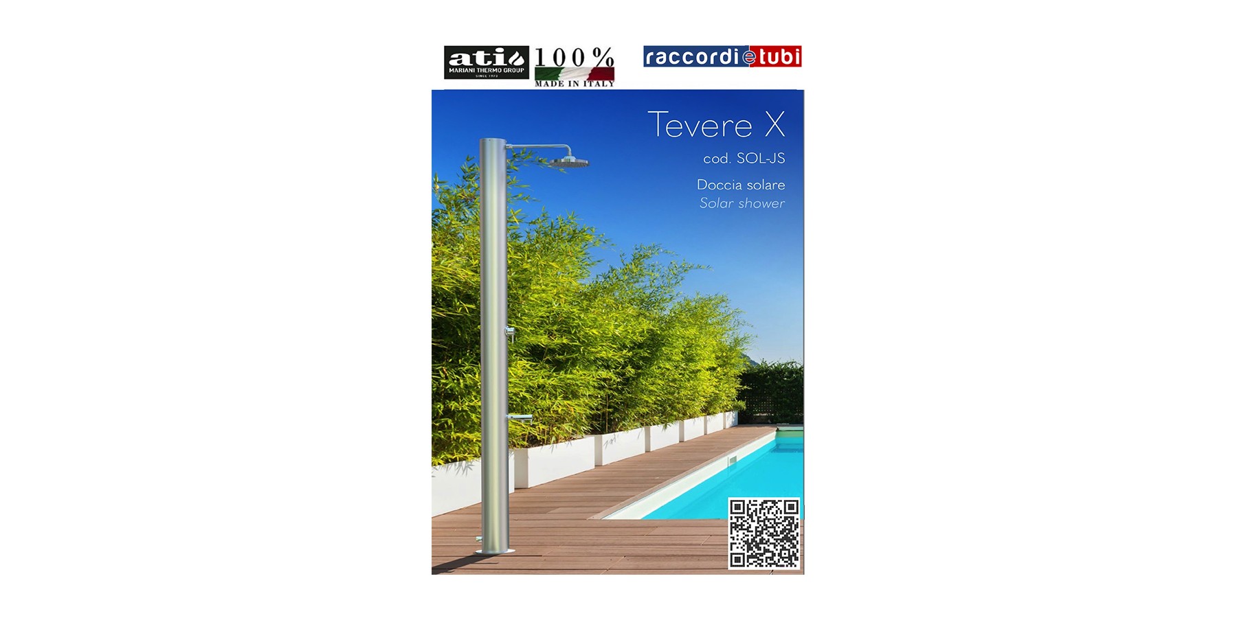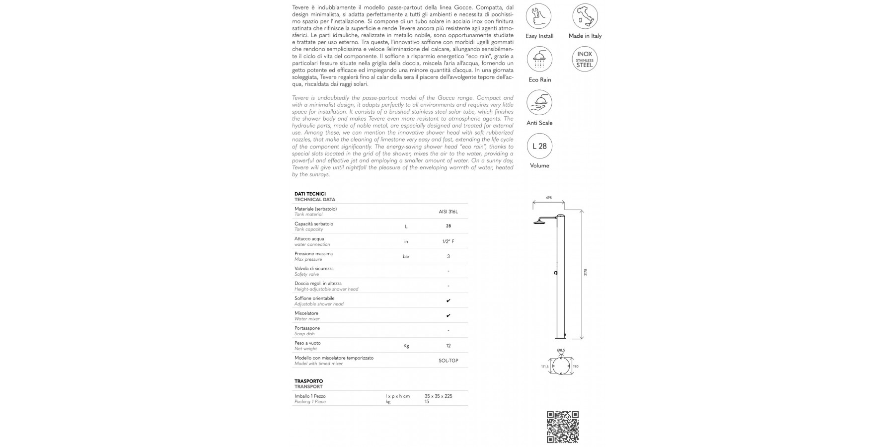 Tevere ist zweifellos das Universalmodell der Gocce-Linie. Kompakt, mit minimalistischem Design, passt es sich perfekt an alle Umgebungen an und benötigt sehr wenig Platz für die Installation. Es besteht aus einem Solarrohr aus Edelstahl mit satinierter Oberfläche, die die Oberfläche veredelt und Tevere noch widerstandsfähiger gegen Witterungseinflüsse macht. Die hydraulischen Teile, die aus edlem Metall gefertigt sind, sind speziell für den Außenbereich konzipiert und behandelt. Dazu gehört der innovative Duschkopf mit weichen Gummi-Düsen, die die Kalkentfernung besonders einfach und schnell machen und die Lebensdauer der Komponente deutlich verlängern. Der energiesparende „Eco Rain“-Duschkopf mischt dank spezieller Öffnungen im Duschkopfrost Luft mit Wasser, liefert einen kraftvollen und effektiven Strahl und verwendet weniger Wasser. An einem sonnigen Tag schenkt Tevere bis in den Abend hinein das angenehme, von der Sonne erwärmte Wasser.