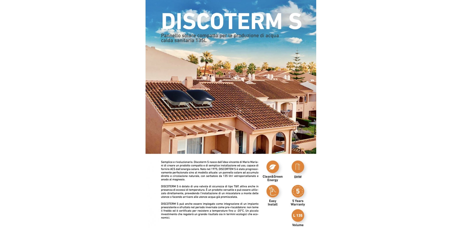 Einfach und revolutionär. Discoterm S entstand aus der erfolgreichen Idee von Mario Mariani, ein kompaktes Produkt zu schaffen, das einfach zu installieren und zu benutzen ist und Warmwasser (ACS) mit Solarenergie bereitstellen kann. Seit seiner Entstehung im Jahr 1975 wurde DISCOTERM S kontinuierlich weiterentwickelt bis zum aktuellen Modell: ein Solarmodul mit direkter Speicherung und natürlicher Zirkulation, mit einem 135-Liter-Verglasungsspeicher und Magnesiumanode.
