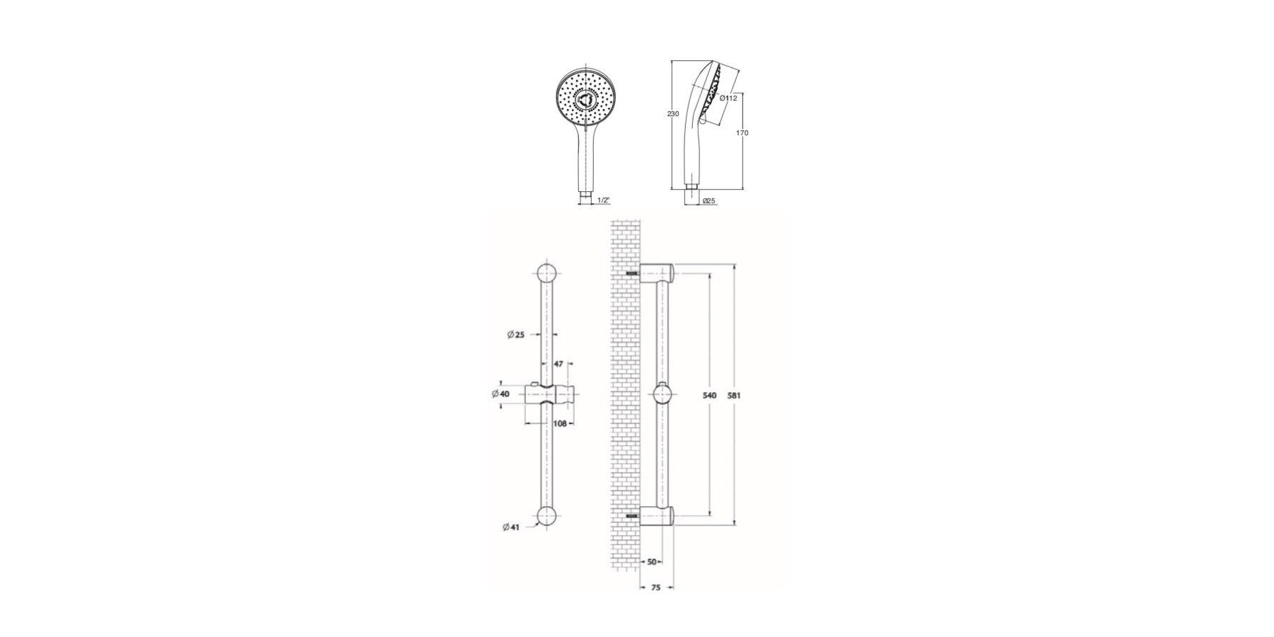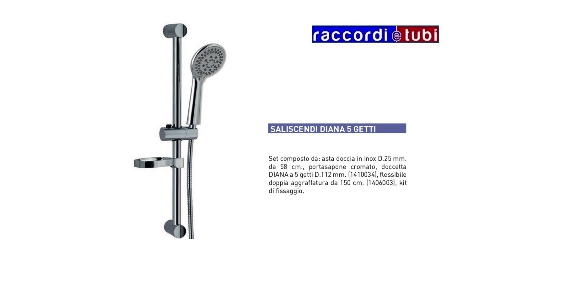 Set bestehend aus: Duschstange aus Edelstahl Ø 25 mm, 58 cm lang, verchromter Seifenhalter, DIANA Duschkopf mit 5 Strahlen Ø 112 mm (1410034), doppelt ummantelter Schlauch, 150 cm (1406003), Befestigungsset.