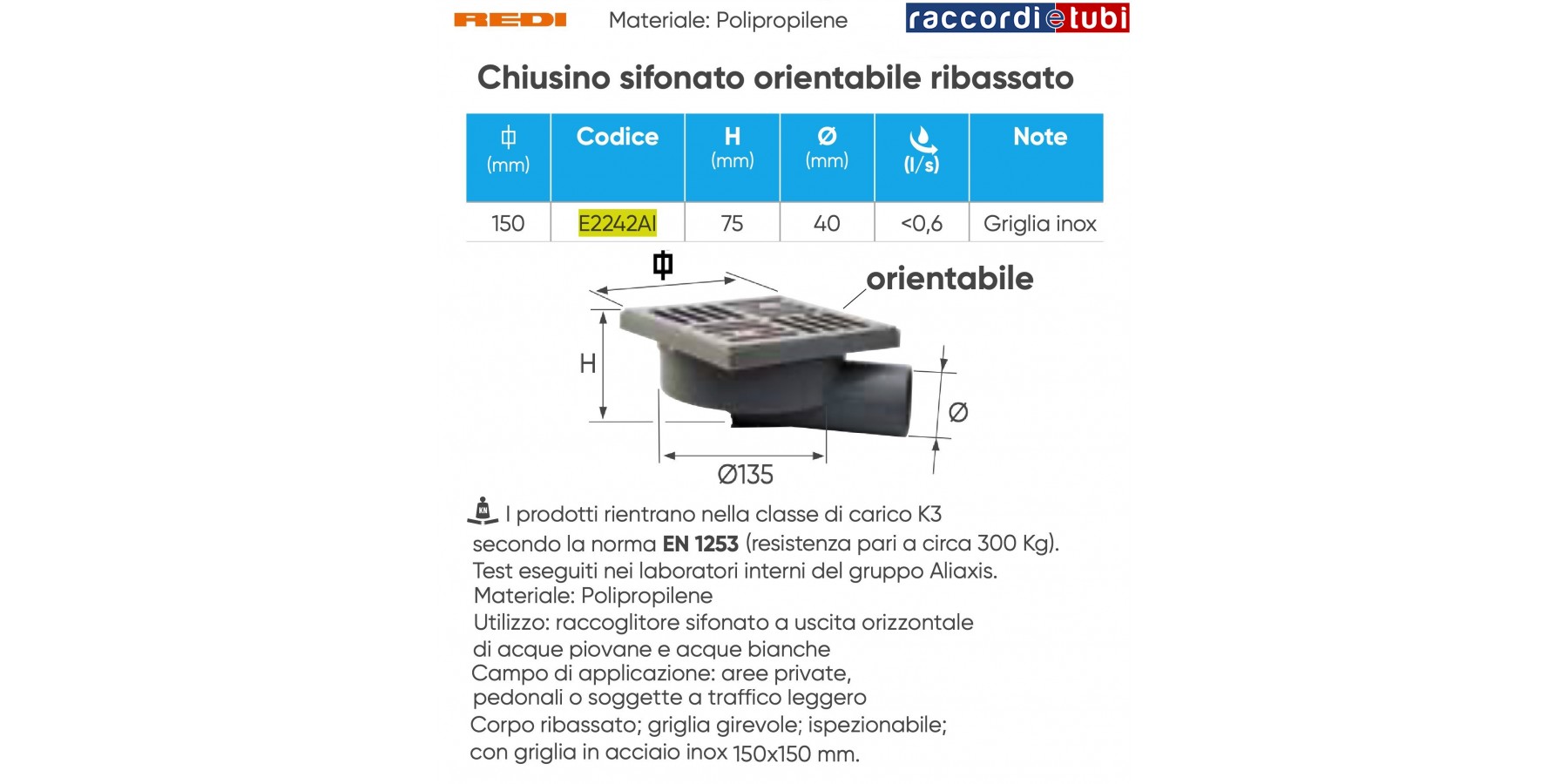 SYFONABDECKUNG CM.15X15 MIT EINSTELLBARER PLATTE REDI E2242AI SEITLICHER ANSCHLUSS DURCHMESSER 40 AUS POLYPROPYLEN