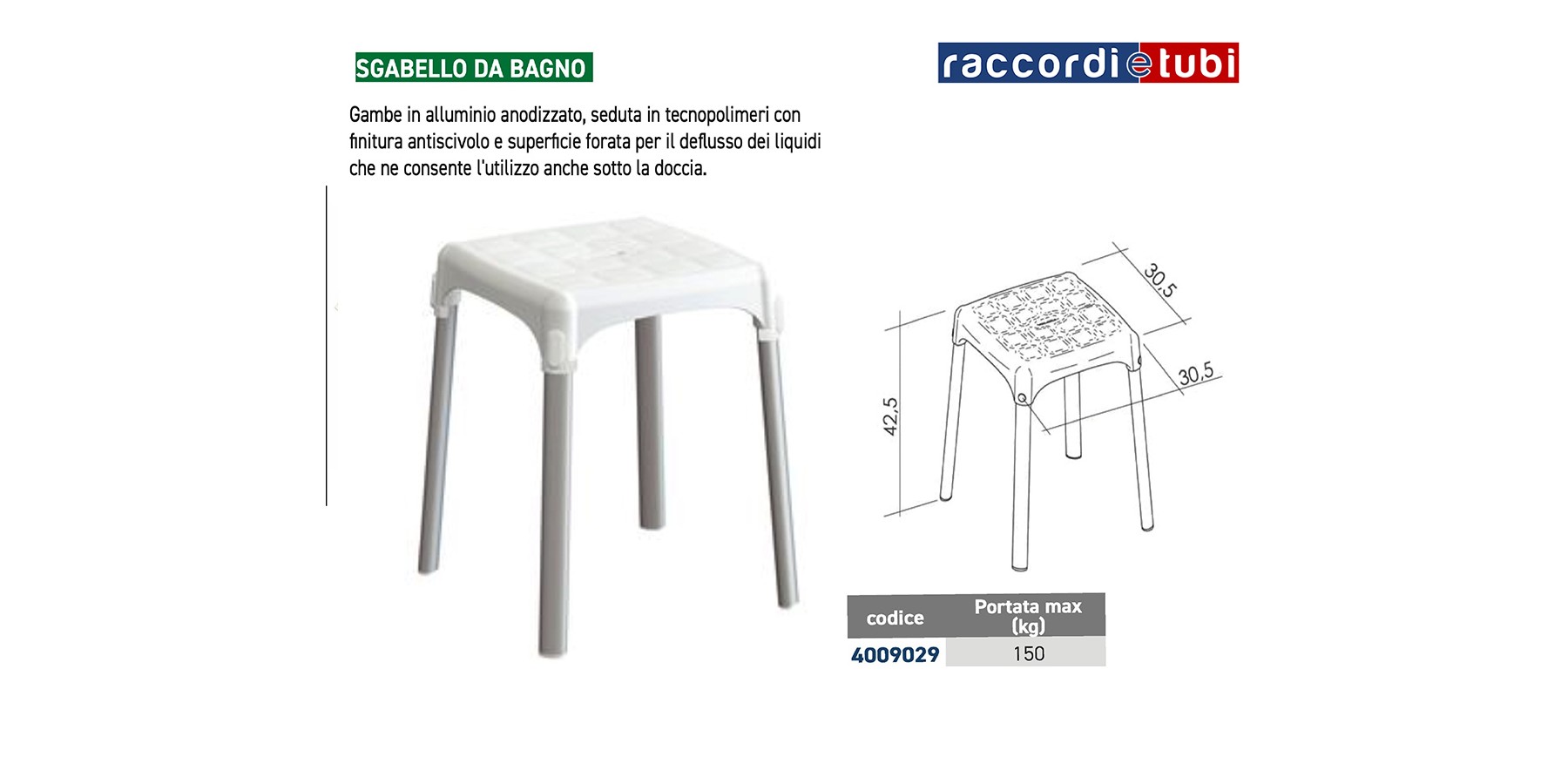 Beine aus eloxiertem Aluminium, Sitzfläche aus Technopolymeren mit rutschfester Oberfläche und perforierter Fläche zum Ablaufen von Flüssigkeiten, was die Nutzung auch unter der Dusche ermöglicht.