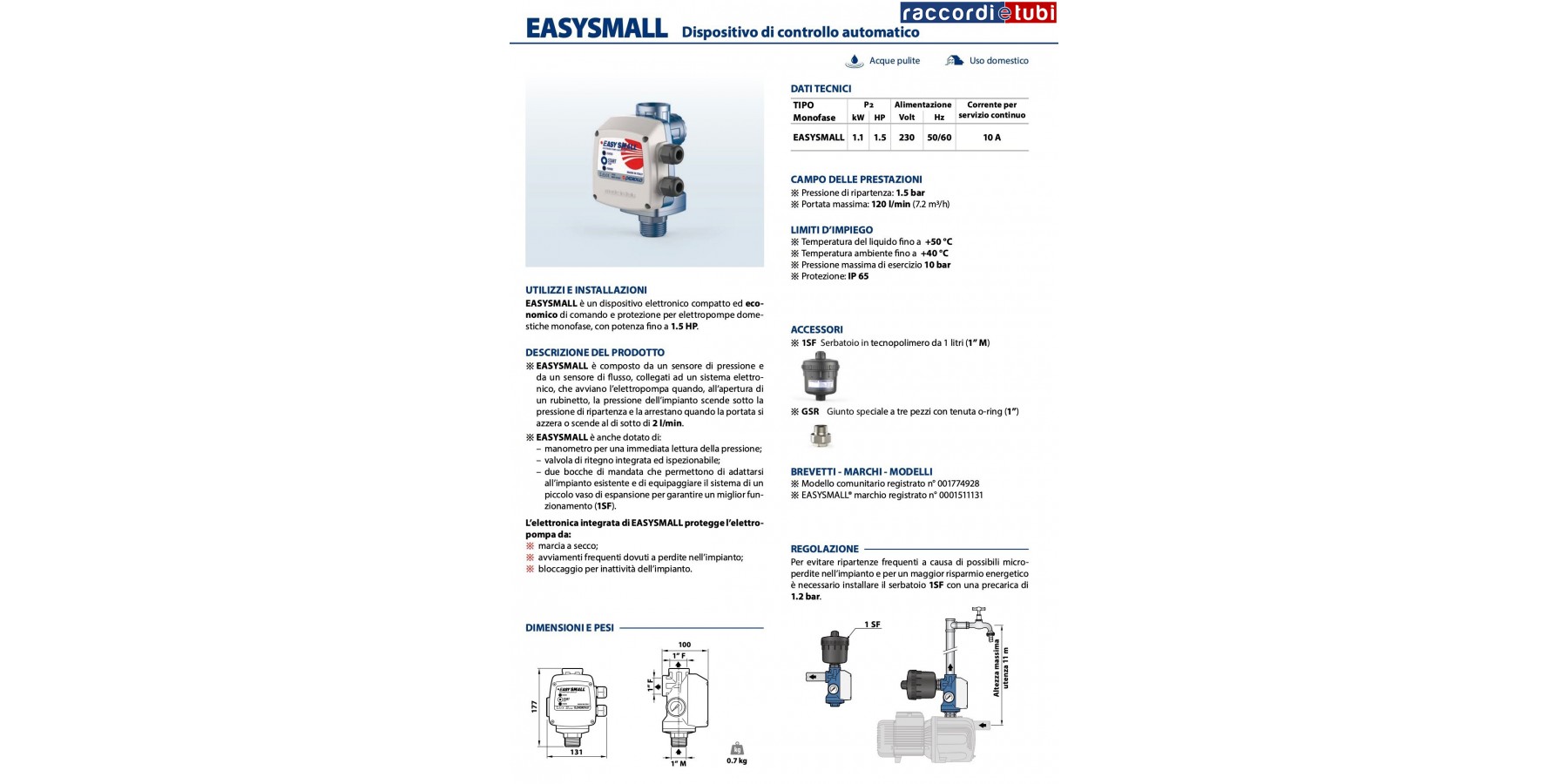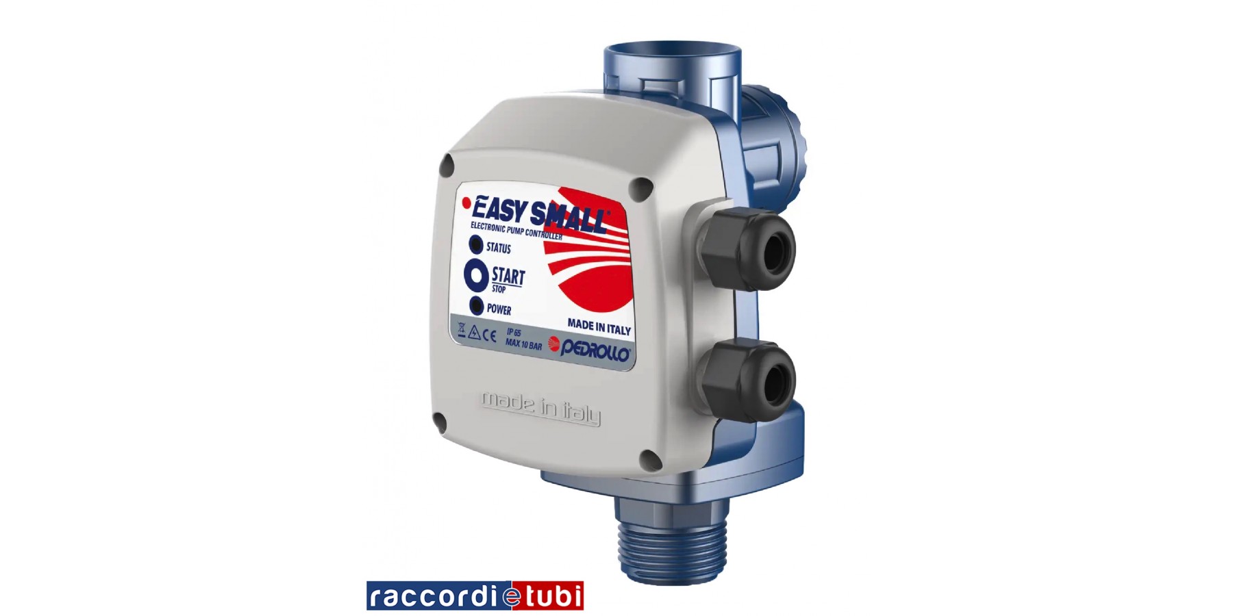 Druck-Durchfluss-Schalter zur Steuerung und Absicherung von einphasigen Pumpen bis zu 1,5 PS für den Hausgebrauch. Der Druck-Durchfluss-Schalter startet die auf ihm installierte Elektropumpe bei Abfall des Anlagen-Drucks (z. B. Öffnen eines Wasserhahns) und schaltet sie ab, wenn der Durchfluss unter 2 Liter pro Minute sinkt.
