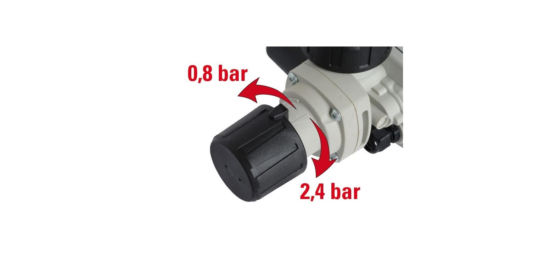 Die Hauptfunktion von Presflo Vario besteht darin, den Schaltpunkt des Pumpendrucks sehr einfach durch Betätigung des Drehknopfs an der Rückseite zu verstellen. Durch Drehen des schwarzen Knopfs nach rechts oder links ändert sich der Betriebsdruck, der auf dem Manometer an der linken Seite abgelesen werden kann.