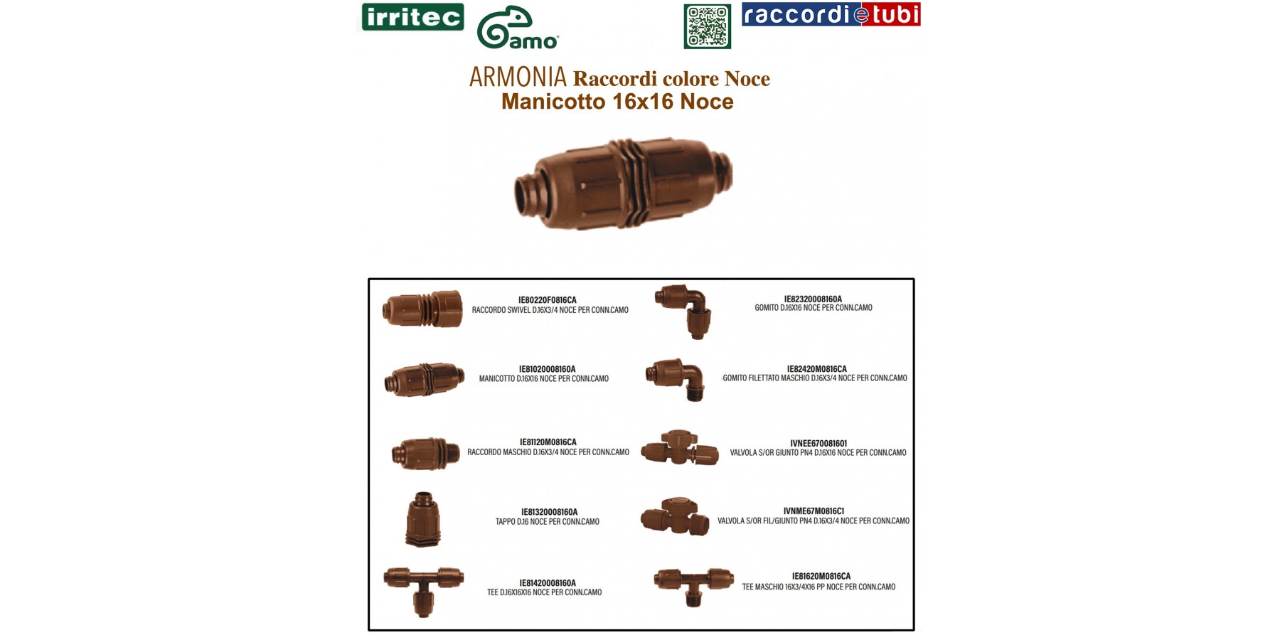 IRRITEC-CAMO Verbindungsteile Durchmesser 16 für PE-Rohre mit niedriger Dichte und Tropfschlauch, speziell gewidmet aufgrund seiner Farben Nussbaum und Bambus, NEUES IRRITEC Pro-jekt Camo