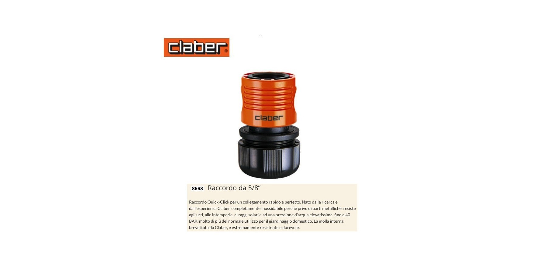 Schnell-Click-Kupplung für eine schnelle und perfekte Verbindung. Entstanden aus Forschung und Erfahrung von Claber, vollständig rostfrei, da ohne Metallteile, widersteht Stößen, Witterungseinflüssen, Sonnenstrahlen und einem extrem hohen Wasserdruck: bis zu 40 BAR, weit mehr als der normale Einsatz im heimischen Gartenbereich. Die von Claber patentierte Innenfeder ist äußerst widerstandsfähig und langlebig.
