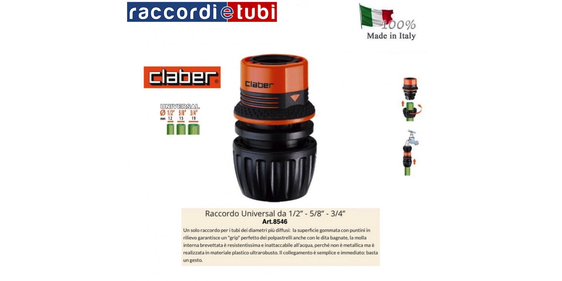 Ein einziger Anschluss für die am weitesten verbreiteten Rohrdurchmesser: Die gummierte Oberfläche mit erhabenen Punkten sorgt für perfekten Halt der Fingerspitzen auch bei nassen Fingern, die patentierte Innenfeder ist extrem widerstandsfähig und wasserresistent, da sie nicht aus Metall, sondern aus besonders robustem Kunststoff gefertigt ist. Die Verbindung ist einfach und sofort möglich: ein einziger Handgriff genügt.