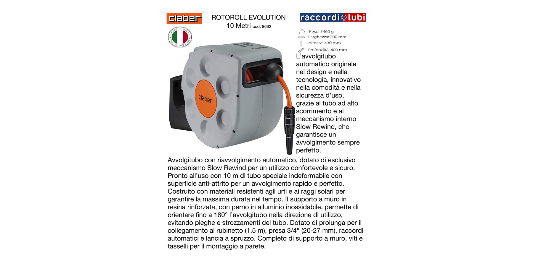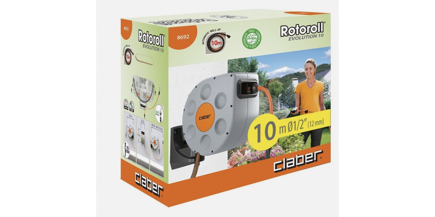 Schlauchaufroller mit automatischem Aufwickeln, ausgestattet mit dem exklusiven Slow-Rewind-Mechanismus für eine komfortable und sichere Anwendung. Gebrauchsbereit mit 10 m speziellem, formbeständigem Schlauch mit reibungsarmer Oberfläche für schnelles und perfektes Aufwickeln. Hergestellt aus stoß- und sonnenstrahlenbeständigen Materialien, um maximale Haltbarkeit zu gewährleisten. Die an der Wand montierbare Halterung aus verstärktem Harz mit Edelstahl-Aluminium-Achse ermöglicht eine Drehung des Schlauchaufrollers um bis zu 180° in Richtung der Nutzung, wodurch Knicke und Quetschungen des Schlauchs vermieden werden. Ausgestattet mit Verlängerung zum Anschluss an den Wasserhahn (1,5 m), 3/4" Anschluss (20-27 mm), automatischen Kupplungen und Spritzlanze. Komplett mit Wandhalterung, Schrauben und Dübeln für die Wandmontage.