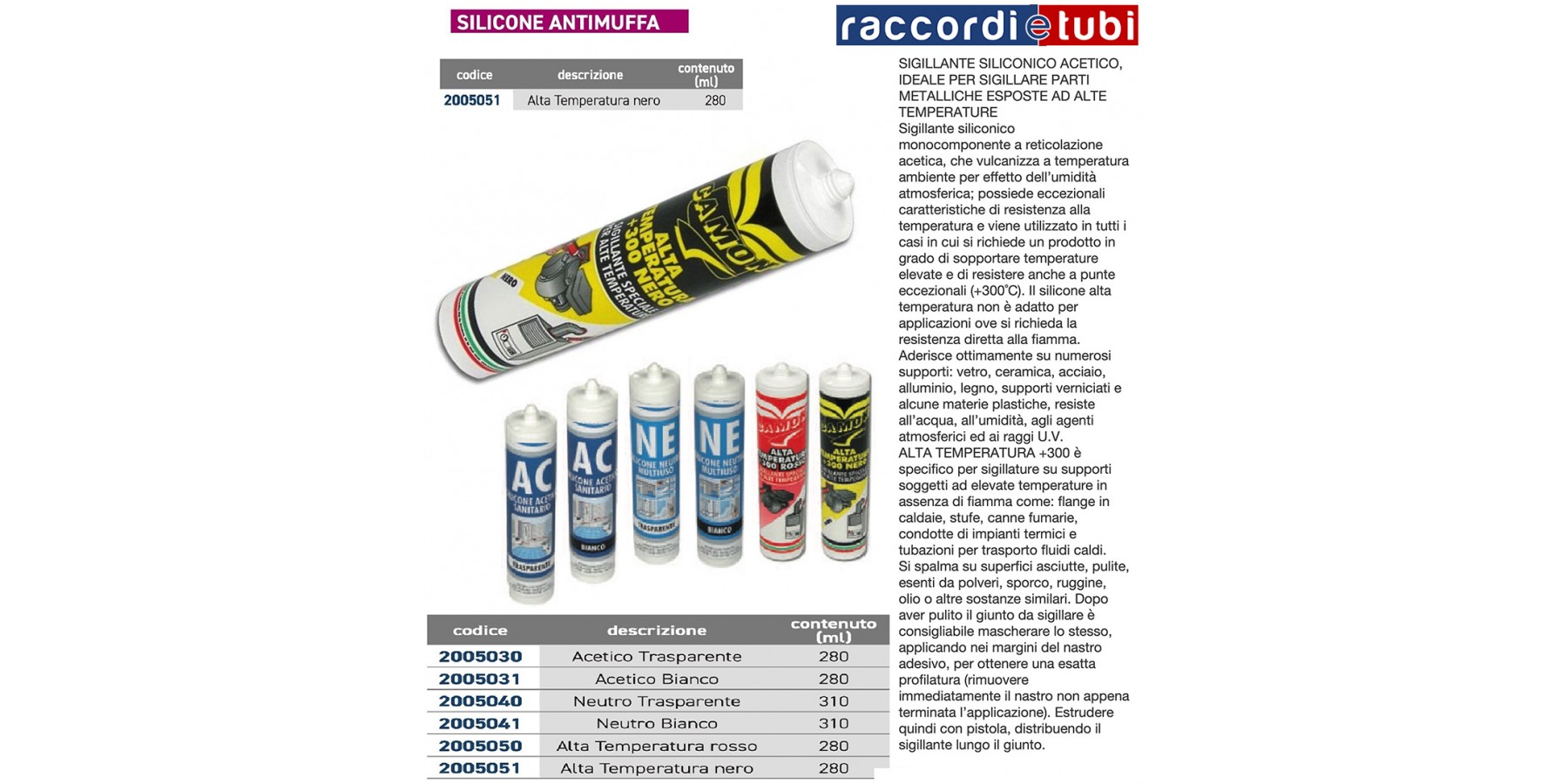 Ein einkomponentiger acetatvernetzender Silikondichtstoff, der bei Raumtemperatur durch atmosphärische Feuchtigkeit vulkanisiert; besitzt außergewöhnliche Temperatureigenschaften und wird überall dort eingesetzt, wo ein Produkt benötigt wird, das hohen Temperaturen standhält und sogar außergewöhnliche Spitzenwerte von +300˚C aushält. Das Hochtemperatursilikon eignet sich nicht für Anwendungen mit direkter Flammenbelastung. Es haftet hervorragend auf zahlreichen Untergründen: Glas, Keramik, Stahl, Aluminium, Holz, lackierte Untergründe und einige Kunststoffe, ist beständig gegen Wasser, Feuchtigkeit, Witterungseinflüsse und UV-Strahlen.