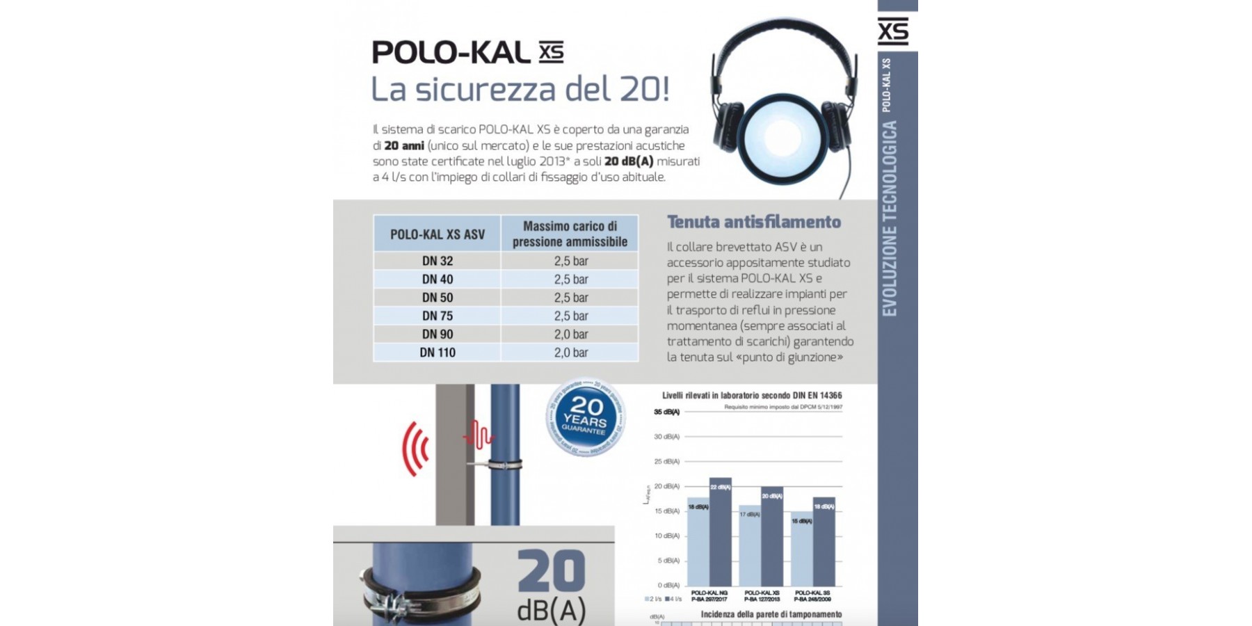 Das POLO-KAL XS Wassersystem kann gemäß den Vorschriften der Planungsnorm UNI EN 12056-2 dimensioniert werden. Nach diesen Vorschriften können für die Lüftung des Entwässerungssystems Rohre und Formstücke des POLO-KAL XS-Systems oder alternativ BAMVENT-Lüftungsventile verwendet werden. In Übereinstimmung mit dem DPCM 5/12/1997 über passive Schallschutzanforderungen in Gebäuden (gesetzliche Regelung in Italien) bietet das POLO-KAL XS Wassersystem nachgewiesene Schalldämmleistungen, zertifiziert gemäß EN 14366 am Fraunhofer-Institut Stuttgart.