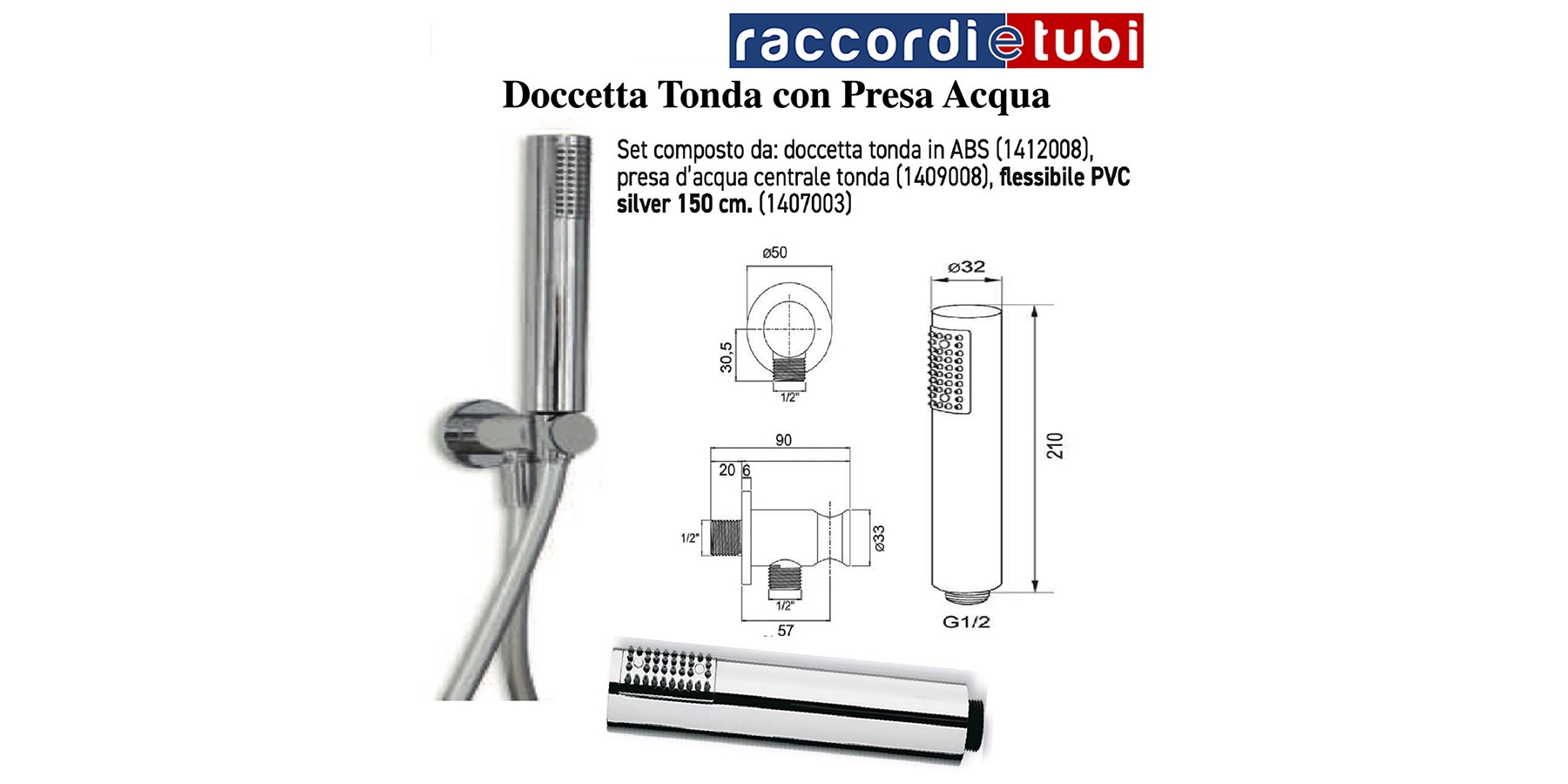 Set bestehend aus: runde Duschbrause aus ABS (1412008), zentrale runde Wasseraufnahme (1409008), 150 cm Silber PVC-Schlauch. (1407003)