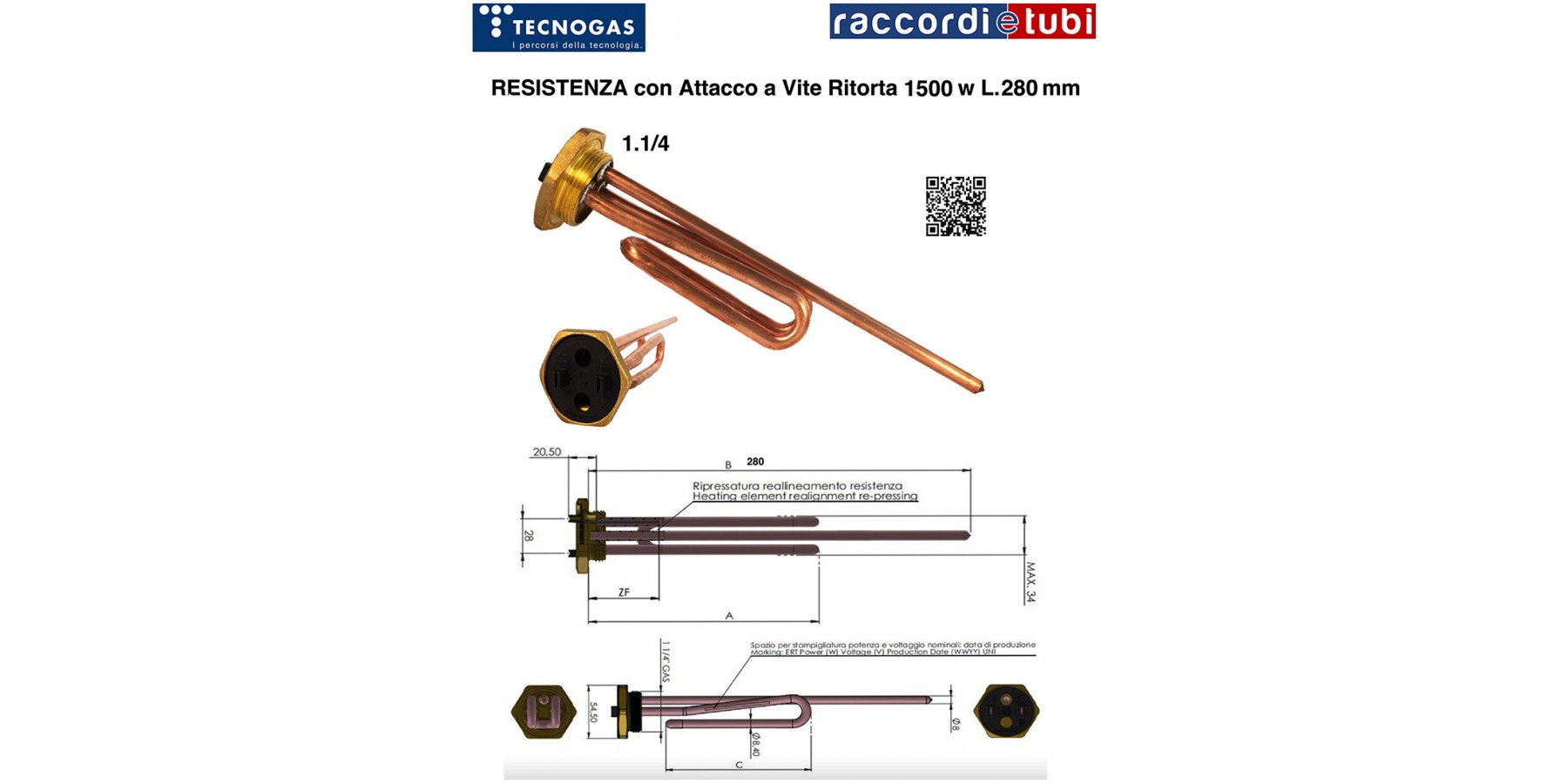 HEIZWIDERSTAND MIT 1.1/4 MÄNNLICHEN VERBINDUNG VERDREHT - 1500 W - L. 280 mm