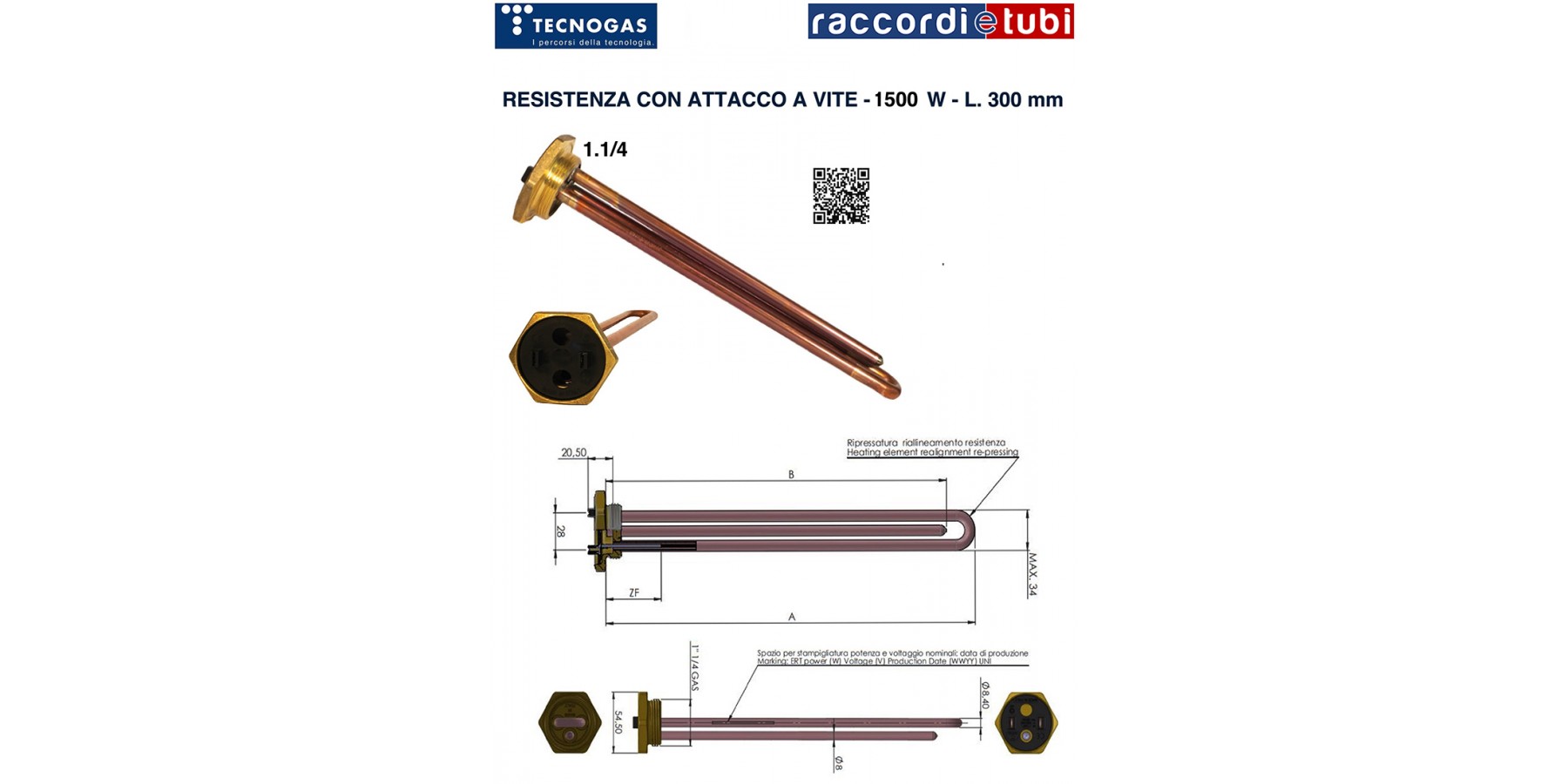HEIZUNG MIT 1.1/4 MÄNNLICHEN ANSCHLUSS 1500 W - L. 300 mm