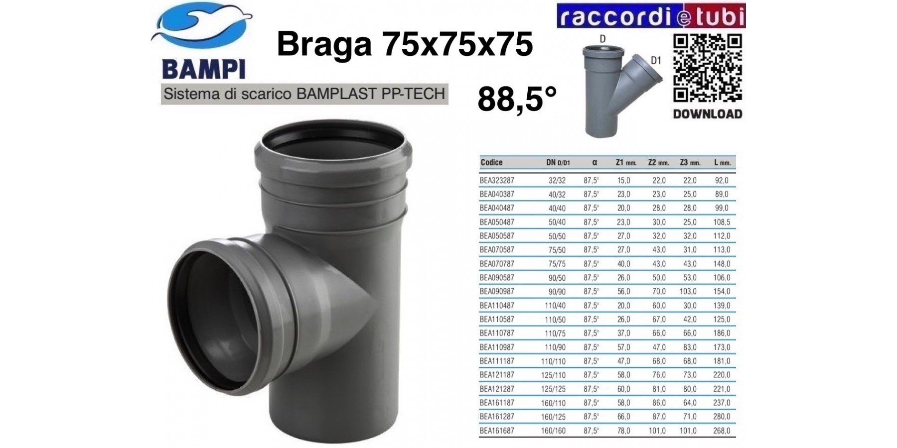 Einfaches und schnelles Installationssystem dank Steckverbindung, gesichert durch eine elastomerische Dichtung. Die Muffenverbindung gewährleistet ausreichenden Raum für eventuelle Ausdehnungen der Anlage mit einer zuverlässigen und dauerhaft garantierten Dichtheit. Das BAMPLAST PP-TECH Polypropylensystem ist kompatibel mit anderen Kunststoffverbindungen aus PP/PE-HD/PVC in Standard-Durchmessern.