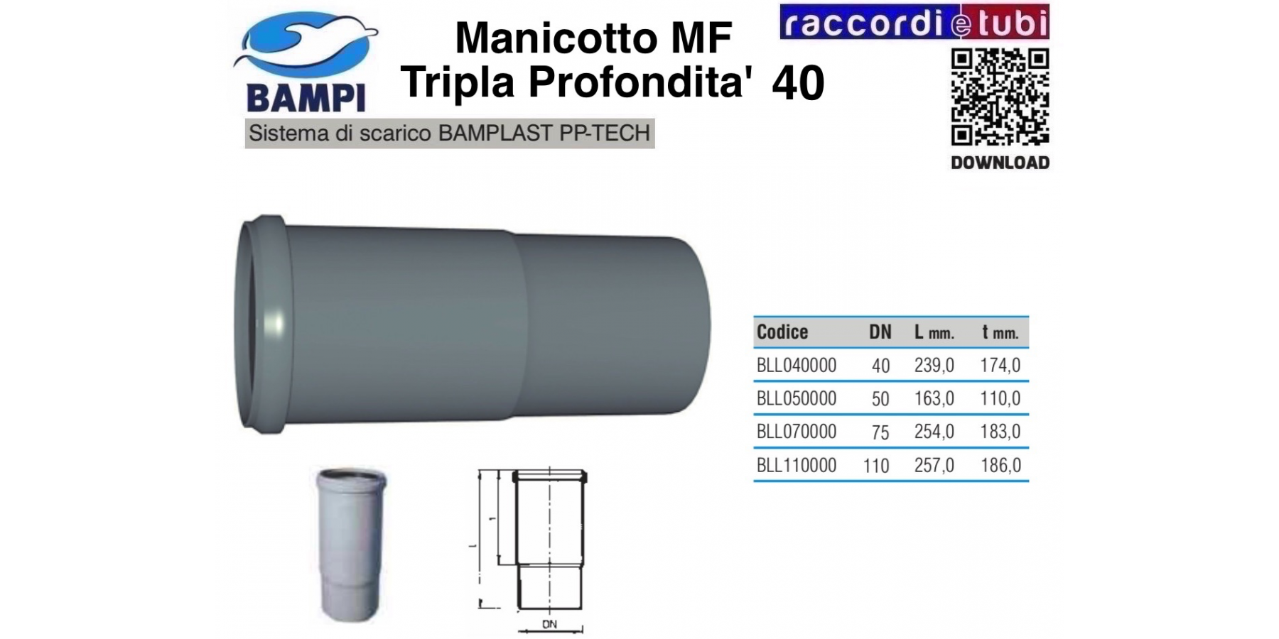 Einfaches und schnelles Montagesystem dank Steckverbindung mit elastomerer Dichtung. Die Muffenverbindung bietet ausreichend Platz für eventuelle Ausdehnungen der Anlage bei zuverlässiger und dauerhafter Dichtheit. Das BAMPLAST PP-TECH System aus Polypropylen ist kompatibel zu Verbindungen mit anderen Kunststoffen wie PP/PE-HD/PVC in Standarddurchmessern.