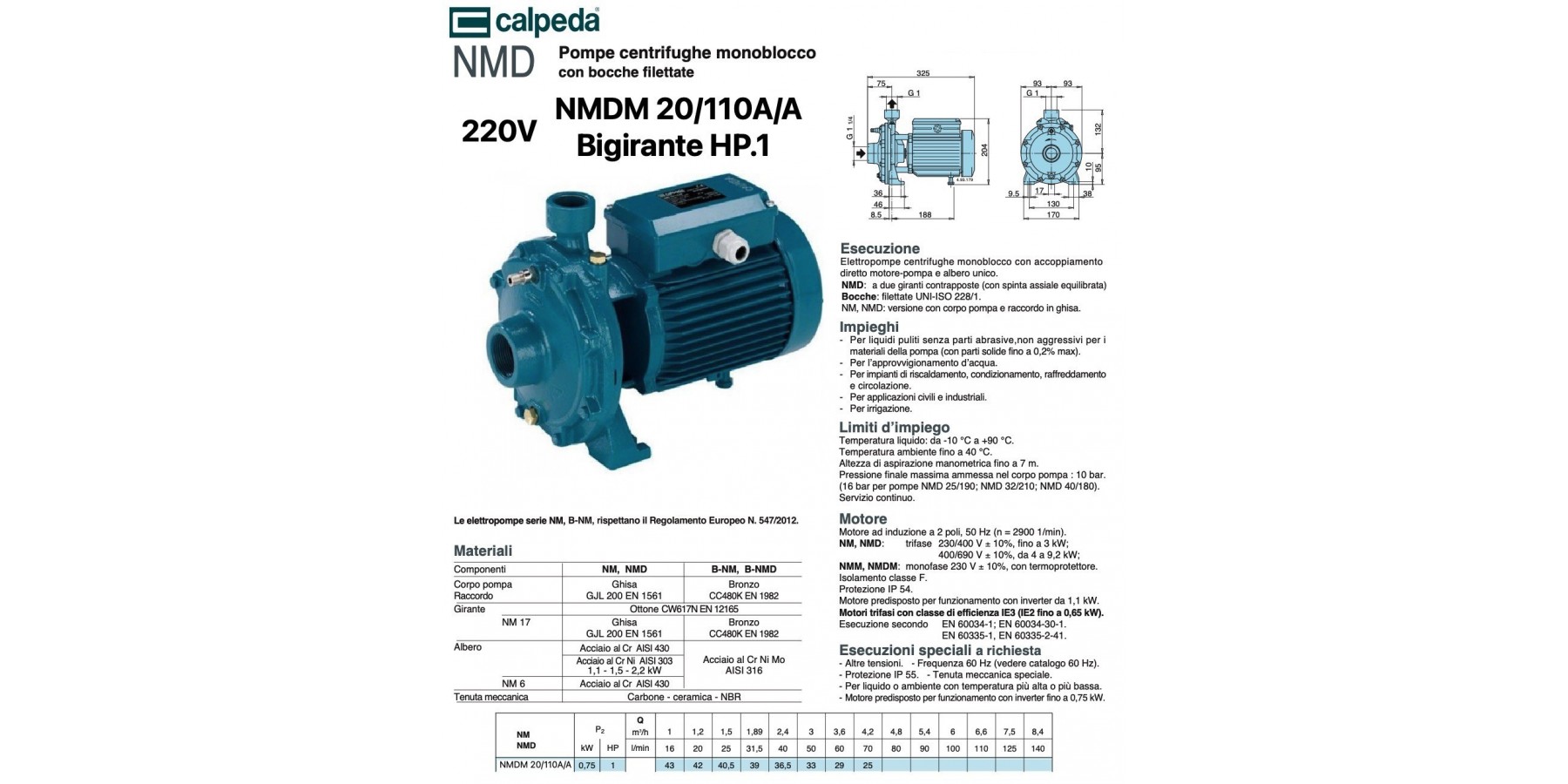 Ausführung einblockige Kreiselpumpen mit direkter Kupplung Motor-Pumpe und einzelwelle. NM: einläufig. NMD: mit zwei gegenüberliegenden Laufrädern (mit ausgeglichener Axialkraft). Anschlüsse: Gewinde UNI-ISO 228/1. NM, NMD: Ausführung mit Pumpengehäuse und Flansch aus Gusseisen. B-NM, B-NMD: Ausführung mit Pumpengehäuse und Flansch aus Bronze. Bronze-Pumpen werden komplett lackiert geliefert. Anwendungen - Für saubere Flüssigkeiten ohne abrasive Bestandteile, nicht aggressiv gegenüber den Pumpenwerkstoffen (mit Feststoffanteil bis max. 0,2%). - Zur Wasserförderung. - Für Heizungs-, Klima-, Kühl- und Umlaufanlagen. - Für zivile und industrielle Anwendungen. - Für Bewässerung. Einsatzgrenzen Flüssigkeitstemperatur: von -10 °C bis 90 °C. Umgebungstemperatur bis 40 °C. Manometrische Ansaughöhe bis 7 m. Maximal zulässiger Enddruck am Pumpengehäuse: 10 bar. (16 bar für Pumpen NMD 25/190; NMD 32/210; NMD 40/180). Dauerbetrieb. Motor Induktionsmotor mit 2 Polen, 50 Hz (n = 2900 U/min). NM, NMD: Drehstrom 230/400 V ± 10%, bis 3 kW; 400/690 V ± 10%, von 4 bis 9,2 kW; NMM, NMDM: Einphasenmotor 230 V ± 10%, mit Thermoschutz. Isolationsklasse F. Schutzart IP 54. Motor vorbereitet für Betrieb mit Frequenzumrichter ab 1,1 kW. Drehstrommotoren mit Wirkungsgradklasse IE3 (IE2 bis 0,65 kW). Ausführung nach EN 60034-1; EN 60034-30-1. EN 60335-1, EN 60335-2-41.