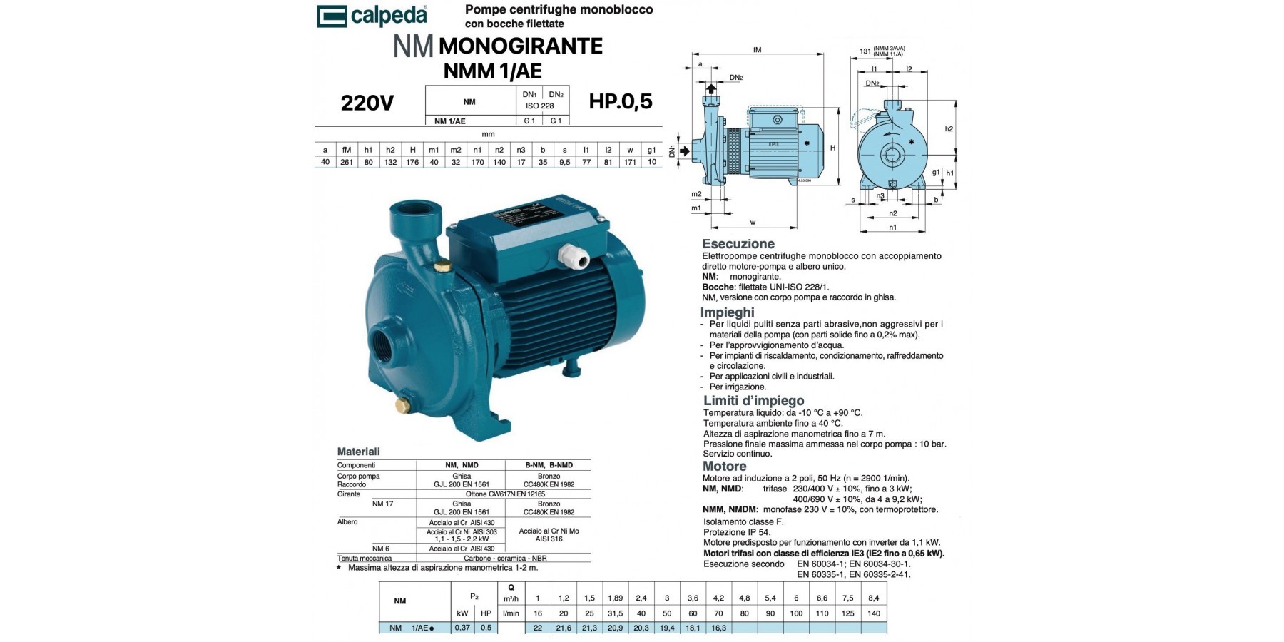 Ausführung Monoblock-Kreiselpumpen mit direkter Kupplung Motor-Pumpe und Einzelwelle. NM: Einfachläufer. NMD: mit zwei gegenüberliegenden Laufrädern (mit axial ausbalancierter Schubkraft). Anschlüsse: Gewinde UNI-ISO 228/1. NM, NMD: Ausführung mit Pumpengehäuse und Anschluss aus Grauguss. B-NM, B-NMD: Ausführung mit Pumpengehäuse und Anschluss aus Bronze. Die Pumpen aus Bronze werden komplett lackiert geliefert. Verwendungszwecke - Für saubere Flüssigkeiten ohne abrasive Partikel, nicht aggressiv gegenüber Materialien der Pumpe (mit Feststoffen bis max. 0,2%). - Zur Wasserversorgung. - Für Heizungs-, Klima-, Kühl- und Umlaufanlagen. - Für zivile und industrielle Anwendungen. - Zur Bewässerung. Einsatzgrenzen Flüssigkeitstemperatur: von -10 °C bis 90 °C. Umgebungstemperatur bis 40 °C. Manometrische Saugehöhe bis zu 7 m. Maximal zulässiger Enddruck im Pumpengehäuse: 10 bar. (16 bar für Pumpen NMD 25/190; NMD 32/210; NMD 40/180). Dauerbetrieb. Motor Asynchronmotor mit 2 Polen, 50 Hz (n = 2900 1/min). NM, NMD: Drehstrom 230/400 V ± 10%, bis 3 kW; 400/690 V ± 10%, von 4 bis 9,2 kW; NMM, NMDM: Einphasen 230 V ± 10% mit Thermoschutzschalter. Isolationsklasse F. Schutzart IP 54. Motor vorbereitet für Betrieb mit Frequenzumrichter ab 1,1 kW. Drehstrommotoren mit Wirkungsgradklasse IE3 (IE2 bis 0,65 kW). Ausführung gemäß EN 60034-1; EN 60034-30-1. EN 60335-1, EN 60335-2-41.