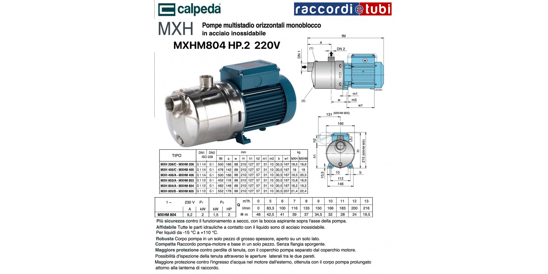 MXHLM: Einphasen 230 V ± 10%, mit Thermoschutz.