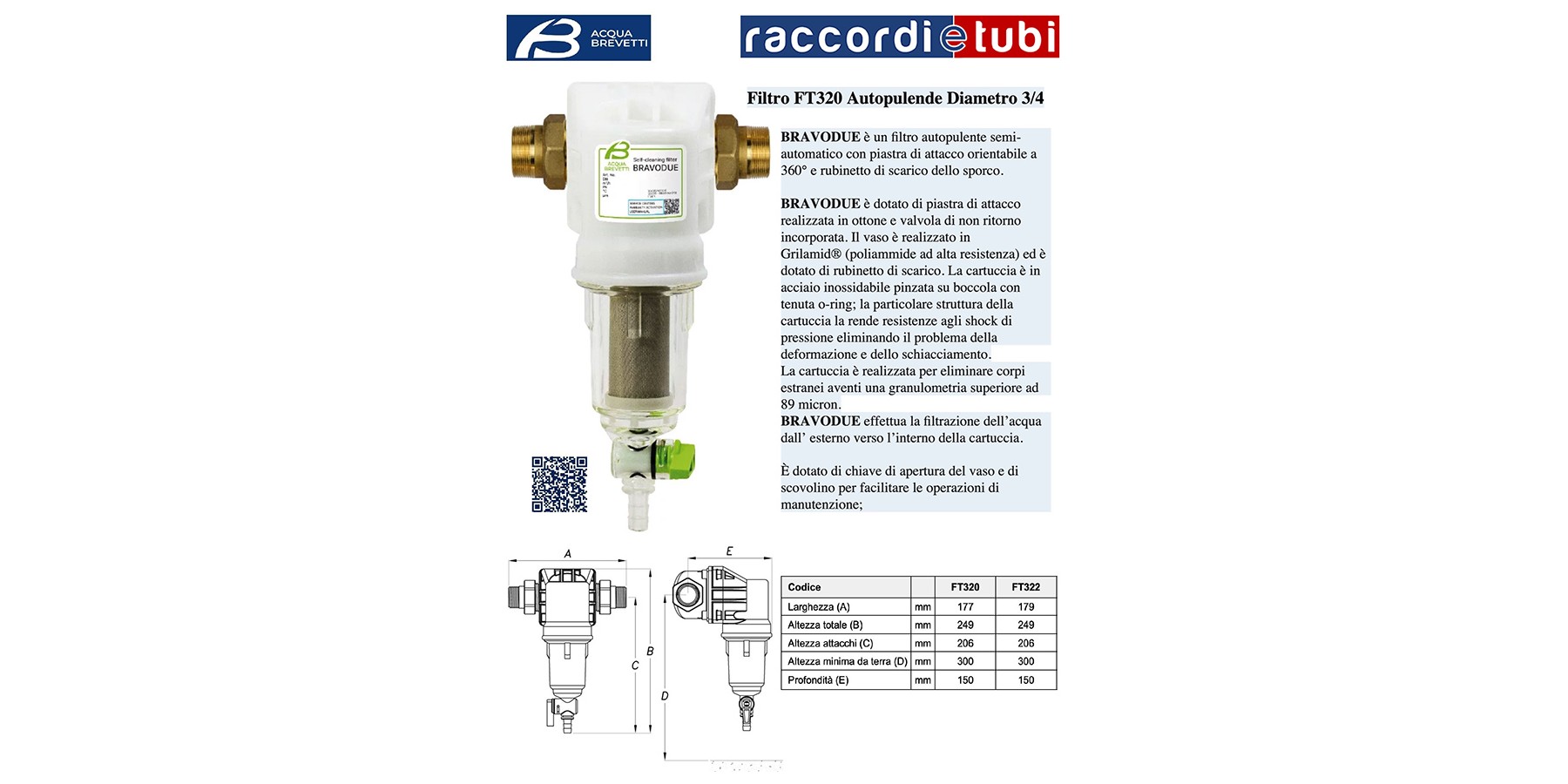 BRAVODUE ist ein halbautomatischer Selbstreinigungsfilter mit einer um 360° drehbaren Anschlussplatte und einem Schmutzwasserablasshahn. BRAVODUE ist mit einer Anschlussplatte aus Messing und einem eingebauten Rückschlagventil ausgestattet. Das Gefäß besteht aus Grilamid® (hochfeste Polyamid) und besitzt einen Ablasshahn. Die Patrone besteht aus Edelstahl, ist auf einer Buchse mit O-Ring-Dichtung befestigt; die besondere Konstruktion der Patrone macht sie druckstoßfest und beseitigt Probleme wie Verformung und Quetschung. Die Patrone ist so ausgelegt, dass Fremdkörper mit einer Korngröße über 89 Mikron herausgefiltert werden. BRAVODUE filtert das Wasser von außen nach innen durch die Patrone. Es ist mit einem Öffnungsschlüssel für das Gefäß und einer Reinigungsbürste für die Wartung ausgestattet. Für Wartungs- und Sanitärmaßnahmen können autorisierte Servicezentren konsultiert werden.