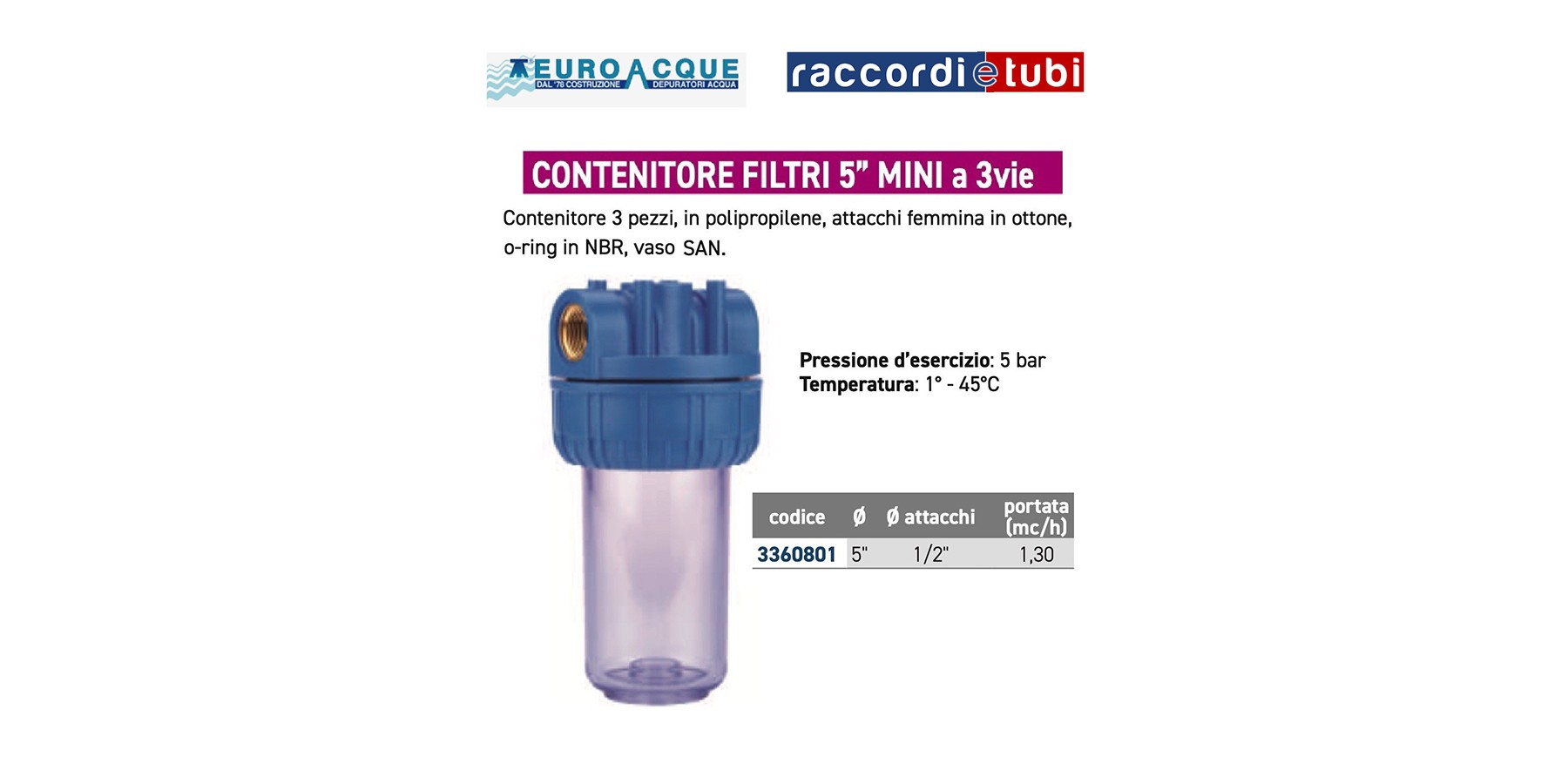 3-teiliges Gehäuse aus Polypropylen, weibliche Anschlüsse aus Messing, O-Ringe aus NBR, Behälter aus SAN.Betriebsdruck: 5 barTemperatur: 1° - 45°C