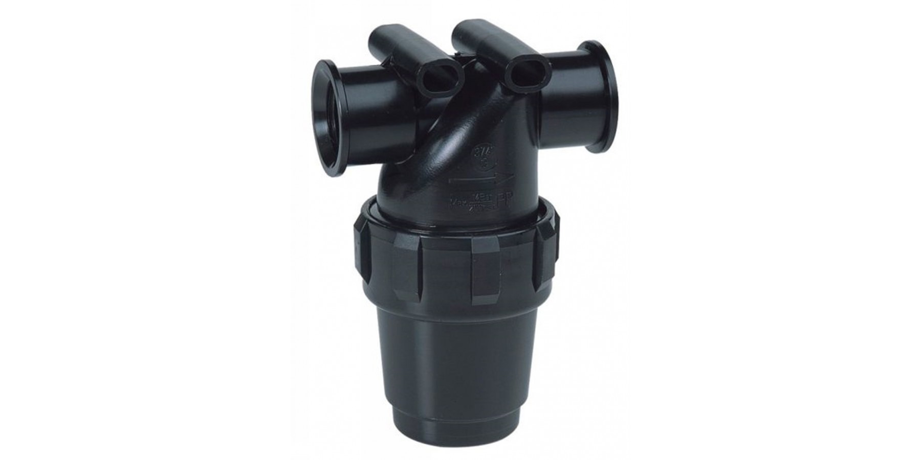 Filter mit Sammelbehälter für Verunreinigungen, kann mit den Rohranschlüssen nach unten installiert werden.