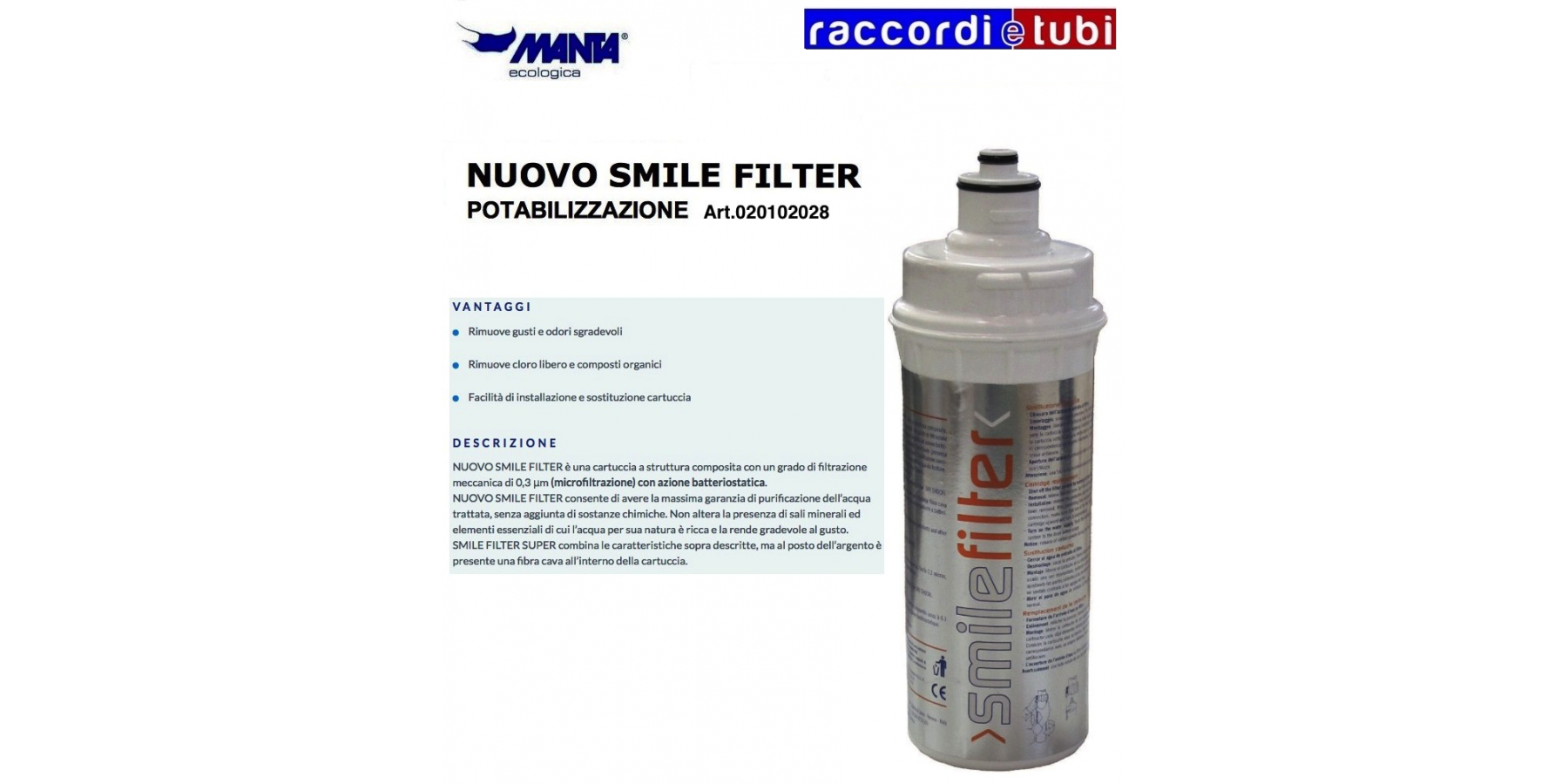Der NEUE SMILE FILTER ermöglicht dank seiner Verbundstruktur die höchste Garantie für die Reinigung des behandelten Wassers, ohne Zusatz von chemischen Substanzen, auf die am wenigsten invasive Weise. Er verändert nicht den Gehalt an Mineralien und essentiellen Elementen, die natürlicherweise im Wasser enthalten sind, und macht es geschmacklich angenehm. Bei trübem Wasser ist eine Vorbehandlung zur Klärung vor dem System erforderlich, um eine langfristig maximale Leistung zu gewährleisten.