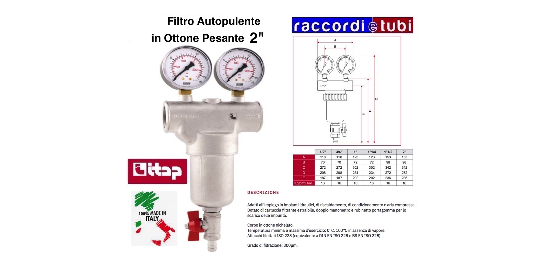 Ausgestattet mit herausnehmbarer Filterkartusche, Doppelmanometer und Wasserhahn mit Schlauchanschluss zum Ablassen von Verunreinigungen.