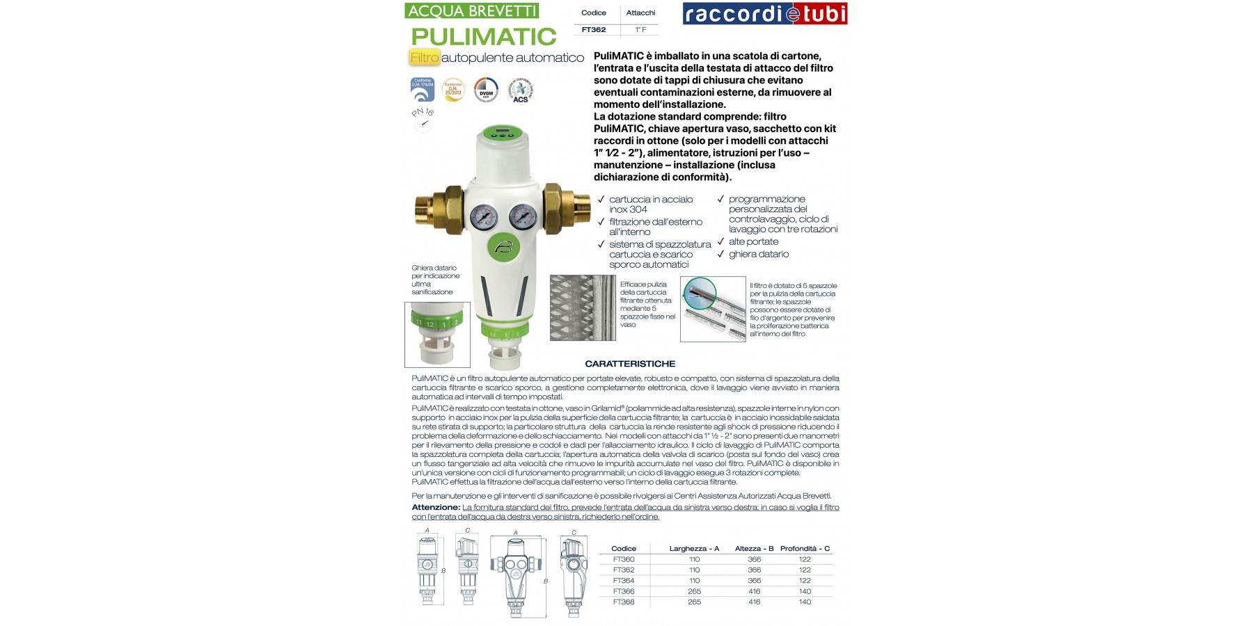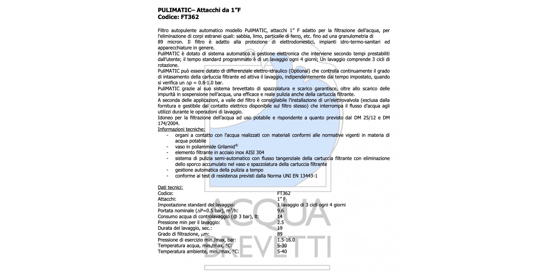 Dank seines patentierten Bürsten- und Entleerungssystems garantiert er neben der Ableitung der im Wasser suspendierten Verunreinigungen auch eine effektive und vollständige Reinigung der Filterkartusche. Je nach Anwendung ist es empfehlenswert, stromaufwärts des Filters ein Magnetventil zu installieren (nicht im Lieferumfang enthalten, steuerbar über den am Filter verfügbaren elektrischen Kontakt), das während der Spülvorgänge den Wasserfluss zu den Verbrauchsstellen unterbricht.