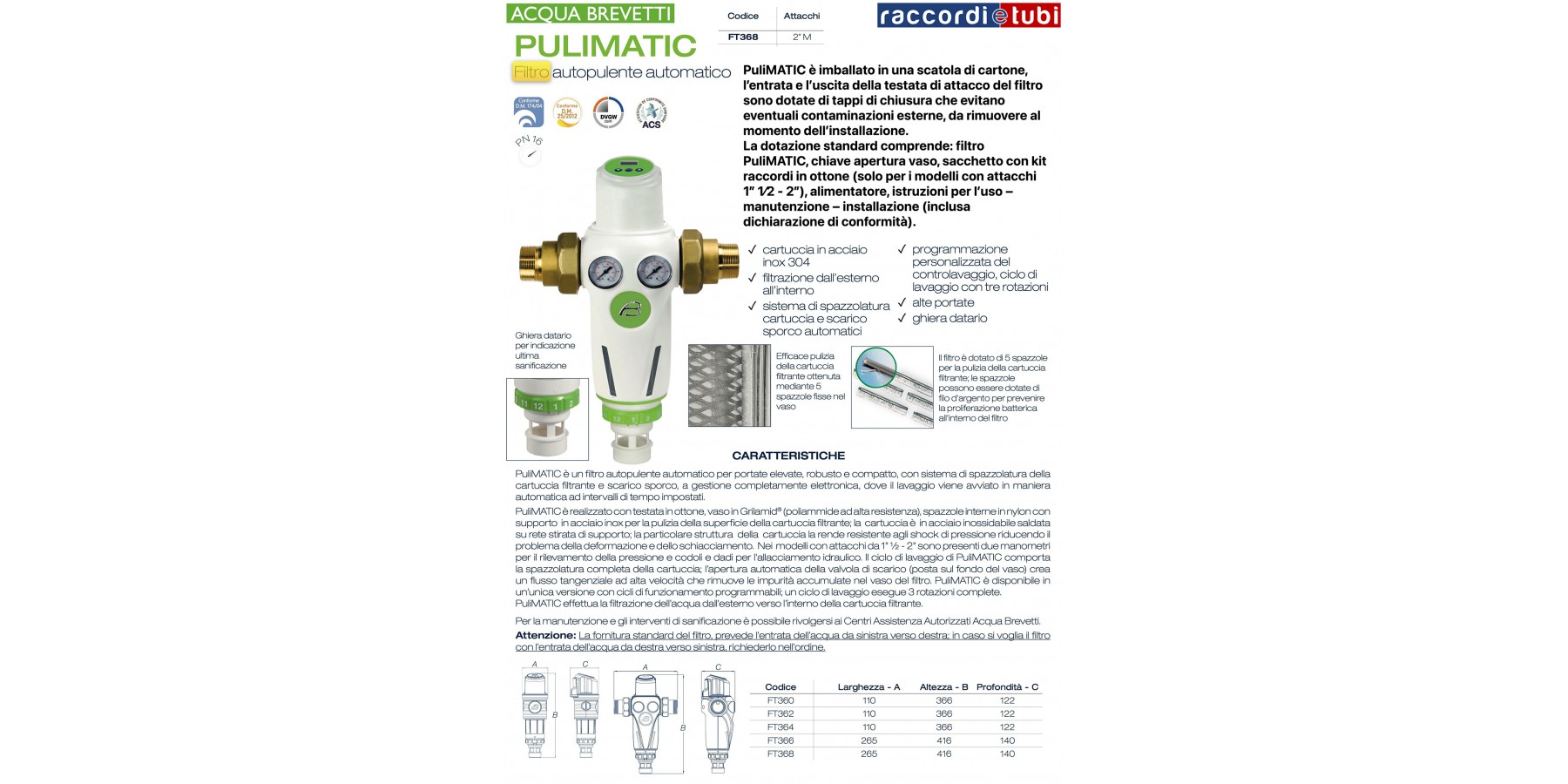 Selbstreinigender PuliMATIC-Filter, geeignet zur Wasserfiltration zur Entfernung von Fremdkörpern wie kleinen Sandmengen, Oxidplättchen, grobem Material usw. bis zu einer Korngröße von 100 Mikron. Der Filter ist geeignet zum Schutz von Heizungs-, Sanitäranlagen, Haushaltsgeräten und allgemein verwendeten Apparaten. PuliMATIC ist mit einem automatischen elektronischen Steuerungssystem ausgestattet, das nach vom Benutzer voreingestellten Zeiten eingreift.