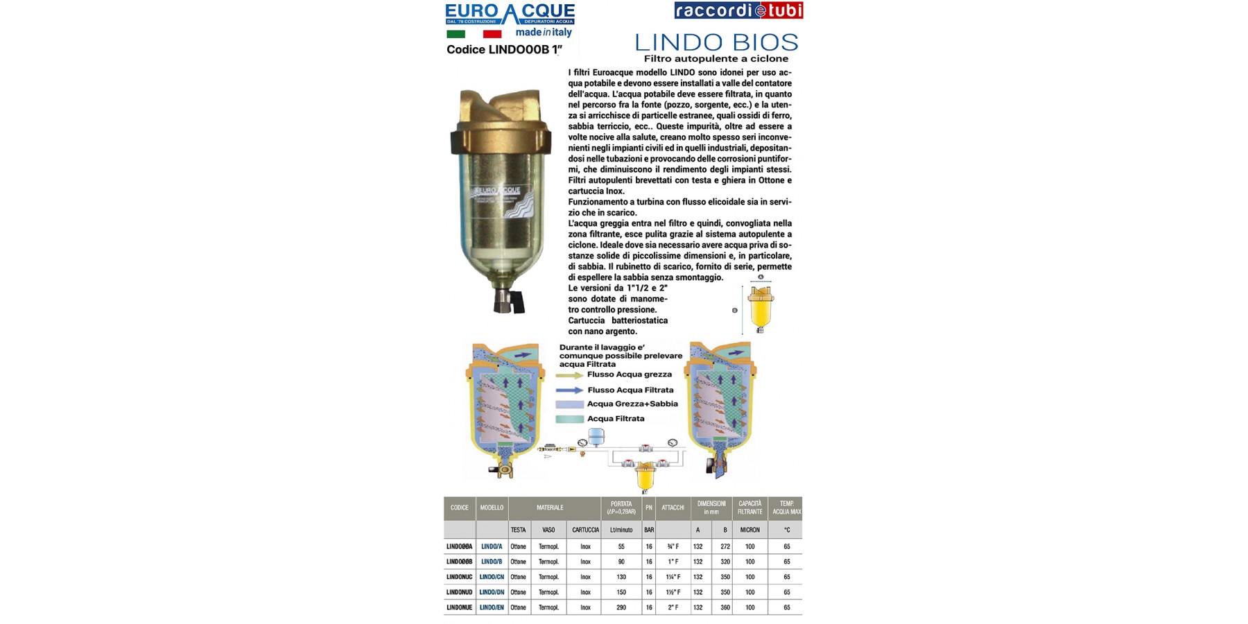 Patentierte Selbstreinigungsfilter mit Messingkopf und -mutter sowie Spiegel-Edelstahlkartusche. Betrieb mit Turbine und spiralförmigem Durchfluss sowohl im Betrieb als auch bei der Entleerung. Das Rohwasser tritt in den Filter ein und wird dann in den Filterbereich weitergeleitet, wo es dank des selbstreinigenden Zyklonsystems sauber austritt. Ideal, wenn Wasser frei von sehr kleinen festen Partikeln, insbesondere Sand, sein muss. Der serienmäßig mitgelieferte Ablasshahn ermöglicht die Sandentfernung ohne Demontage. Die Ausführungen 1"1/2 und 2" sind mit einem Druckmanometer ausgestattet. INKLUSIVES „BIOS“ SYSTEM zur bakteriellen Hemmung.