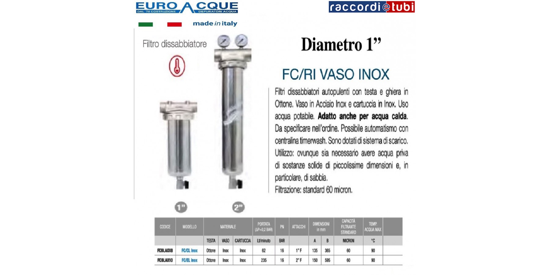 Selbstreinigende Sandabscheiderfilter mit Messingkopf und Mutter. Behälter aus Edelstahl und Kartusche aus Edelstahl. Für Trinkwasser geeignet. Auch für warmes Wasser geeignet, beim Bestellen anzugeben. Automatisierung mit Timerwash-Steuergerät möglich. Ausgestattet mit Entwässerungssystem.