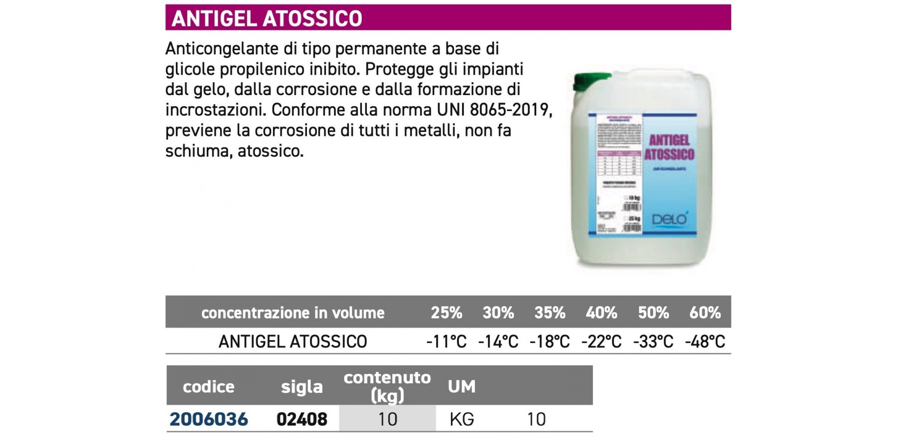 Dauerhaftes Frostschutzmittel auf der Basis von inhibiertem Propylenglykol. Schützt Anlagen vor Frost, Korrosion und Ablagerungen. Entspricht der Norm UNI 8065-2019, verhindert die Metallkorrosion, schäumt nicht, ungiftig.