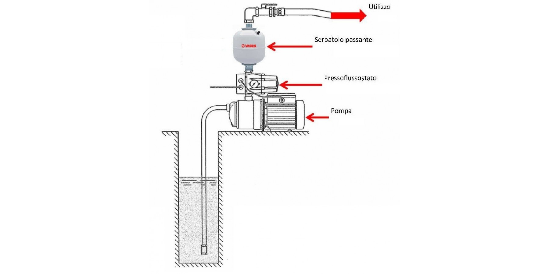 Der Durchflussschalter übernimmt jedoch nicht vollständig die typischen Funktionen des Ausdehnungsgefäßes; das darin enthaltene Wasservolumen ist normalerweise so gering, dass es bei kleinen Entnahmen oder noch schlimmer bei Mikroleckagen keinen hydrodynamischen Schwung erzeugen kann. Dies führt zu abnormalem Pumpenbetrieb mit häufigem und kurzem Ein- und Ausschalten. Die Konsequenzen sind eine verkürzte Pumpenlebensdauer aufgrund vieler Zyklen in kurzer Zeit sowie ein deutlich erhöhter Energieverbrauch. Bei längeren, aber niedrigeren Entnahmen arbeitet die Pumpe dagegen immer auf maximalem Druck, da der Durchflussschalter sie steuert; das Ausdehnungsgefäß erlaubt hingegen dank seiner unter Druck stehenden Wasserreserve, die Pumpe mit maximalem Durchfluss zu nutzen und das Gefäß als hydraulisches Schwungrad für niedrige Entnahmen einzusetzen.