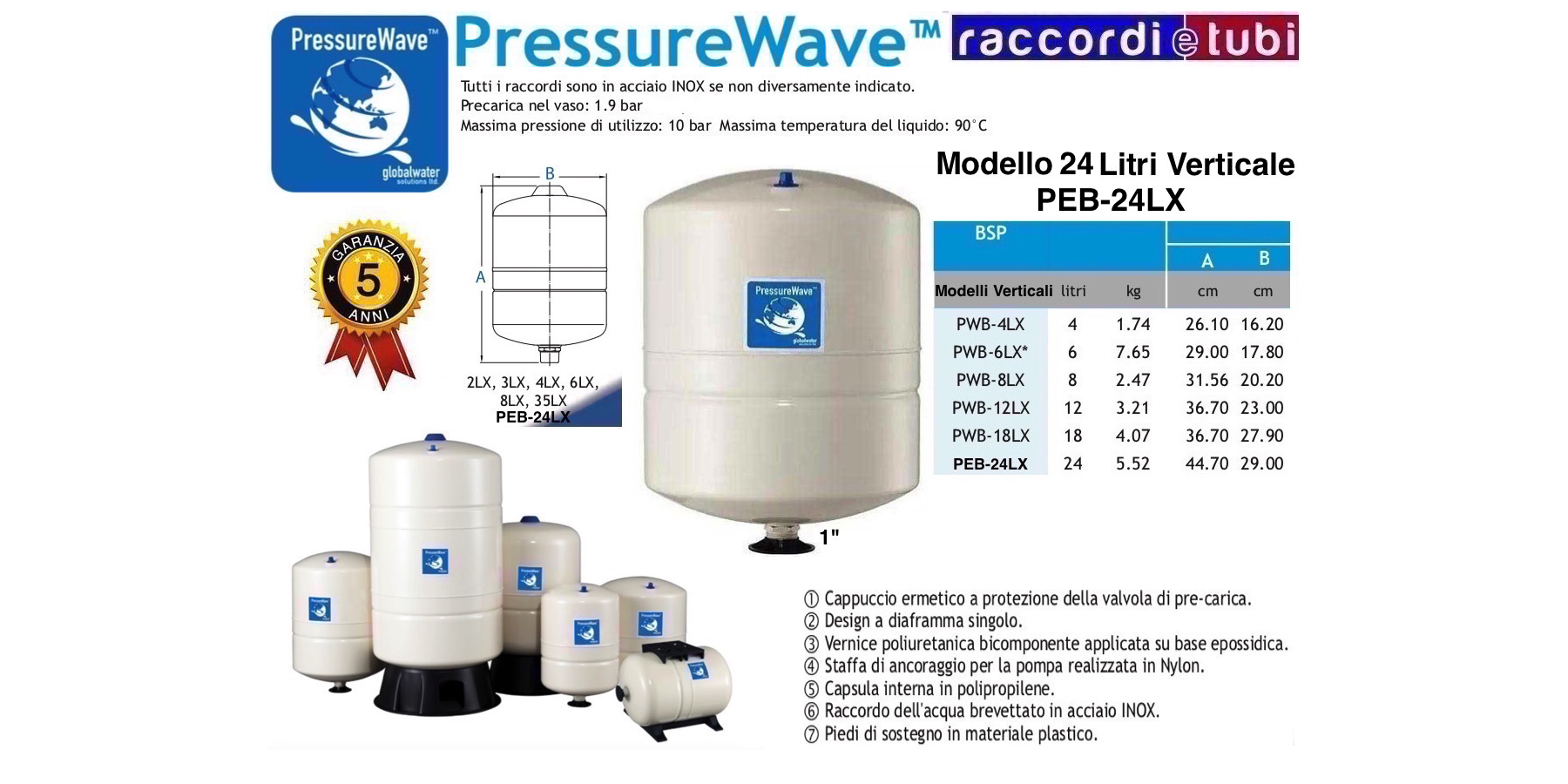 Die PressureWave™ Ausdehnungsgefäße sind ideal für ein breites Anwendungsspektrum wie Drucksysteme, thermische Expansion, Bewässerungsanlagen und Wasserschlagschutz. Die Wasserkammer der PressureWave™ Serie besteht aus einer Beschichtung aus jungfräulichem Polypropylen, kombiniert mit einer Butyl-gummihaltigen Membran (FDA-zertifiziert). Das Diafragma ist mit einem Edelstahlring am Gefäßkörper befestigt. Das Messing-Luftventil, verschlossen mit einer hermetisch abschließenden Schraubkappe, verhindert jeglichen Druckverlust. Der Wassereintritt erfolgt über einen patentierten Anschluss (mit Schraubenaussparung), hergestellt aus EDELSTAHL. Die Polypropylenbeschichtung und das Diafragma sind an verschleißanfälligen Stellen verstärkt, um eine längere Lebensdauer zu gewährleisten. Alle Innenteile, einschließlich des Luftventils, sind abgerundet, um Beschädigungen des Diafragmas bei extremen Betriebsbedingungen zu verhindern. Der spezielle Wasseranschluss bietet eine doppelte Wasser/Luft-Dichtung, die Leckagen ausschließt und den Druck im Gefäß hält. Äußerlich ist das Gefäß mit einem mandel-farbenen Zweikomponenten-Polyurethanlack auf Epoxidbasis beschichtet, der hunderte Stunden Salznebelbeständigkeit und hohen UV-Schutz bietet. Die PressureWave™ Gefäße durchlaufen zahlreiche Qualitätstests im gesamten Produktionsprozess, um die strukturelle Integrität jedes Einzelstücks zu gewährleisten. Die PressureWave™ Gefäße sind die beste Qualitätsinvestition und die besten heute auf dem Markt verfügbaren Ausdehnungsgefäße.