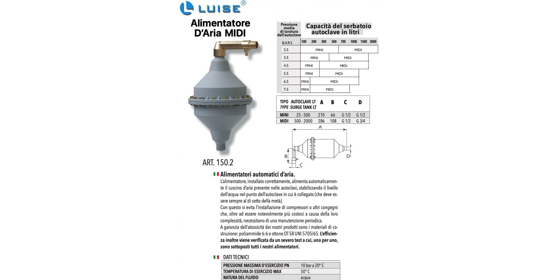 Die Unbedenklichkeit unserer Produkte wird durch die verwendeten Materialien garantiert, nämlich Polyamid 6 : 6 und Messing OT 58 UNI 5705/65; die Effizienz wird zudem durch einen strengen Test überprüft, dem alle unsere Luftversorger einzeln unterzogen werden.