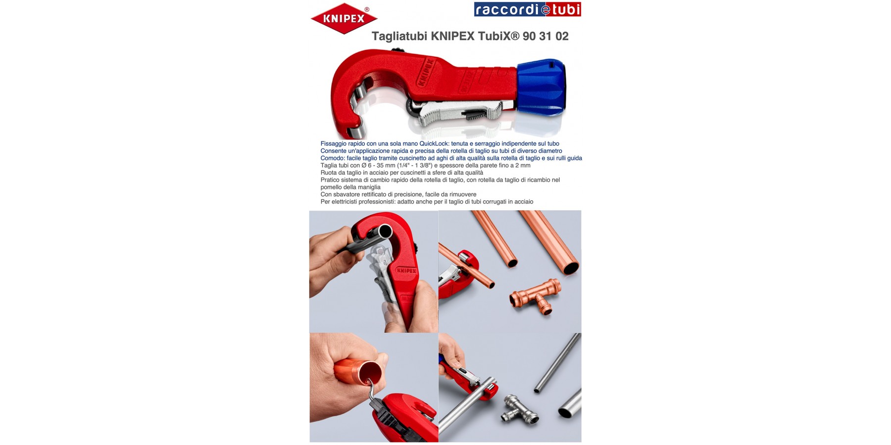 - Rohrabschneider für Ø 6 - 35 mm (1/4" - 1 3/8") und Wandstärke bis 2 mm