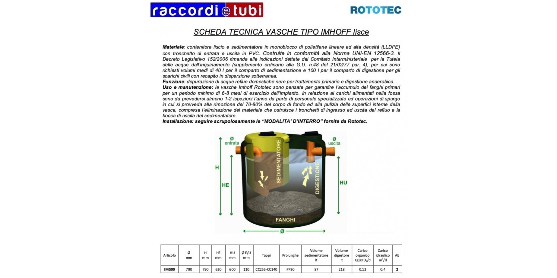 Rohabwässer werden mechanischen Vorbehandlungen unterzogen, um Materialien zu entfernen, die aufgrund ihrer Größe und Eigenschaften Schwierigkeiten bei der korrekten Durchführung der nachfolgenden Reinigungsphasen verursachen würden. In einem häuslichen Ablauf sind 60-70 % der Schwebstoffe sedimentierbar und können daher durch primäre Absetzverfahren entfernt werden. Diese Art der Behandlung ermöglicht auch eine gleichzeitige Entfernung von 25-30 % des organischen Gehalts, gemessen als BSB5. Die Imhoff-Tanks werden als Primärbehandlung für Schwarzwasser aus WC-Anlagen in Haushalten oder ähnlichen Abwassern eingesetzt. Sie bestehen aus zwei übereinander liegenden und hydraulisch verbundenen Kammern. In der oberen Kammer sinken die sedimentierbaren Feststoffe durch die Schwerkraft zum Boden des Absetzers, der eine geeignete Neigung aufweist, um den Schlamm in die untere Kammer zu transportieren, wo die Faulung erfolgt; diese Anlagenart nutzt die kombinierte Wirkung einer mechanischen Sedimentationsbehandlung und einer biologischen Behandlung durch kalte anaerobe Faulung. Imhoff-Tanks müssen durch eine Entölungsphase vorgelagert sein, so kann das behandelte Abwasser entweder zur unterirdischen Versickerung (sofern durch lokale Vorschriften erlaubt) abgeleitet oder einer nachfolgenden Sekundärbehandlung zugeführt werden, um es weiter zu verfeinern und in das geeignete Vorfluter einzuleiten.