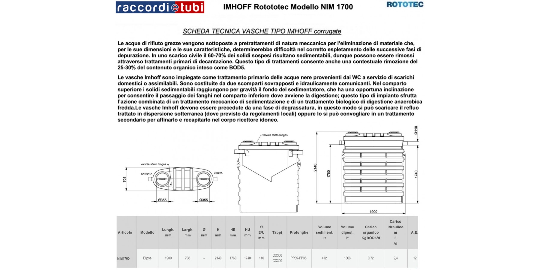 Die Rohabwässer werden einer mechanischen Vorbehandlung unterzogen, um Materialien zu entfernen, die aufgrund ihrer Größe und Eigenschaften Schwierigkeiten bei der korrekten Durchführung der nachfolgenden Reinigungsphasen verursachen würden. In einem kommunalen Abwasser beträgt der Anteil der sedimentierbaren Schwebstoffe 60-70 %, sodass diese durch primäre Absetzbehandlungen entfernt werden können. Diese Behandlungen ermöglichen auch eine gleichzeitige Entfernung von 25-30 % des organischen Gehalts, gemessen als BOD5. Imhoff-Klärbecken werden als Primärbehandlung für Schwarzwasser aus WC-Anlagen in häuslichen oder vergleichbaren Abwassersystemen eingesetzt. Sie bestehen aus zwei übereinanderliegenden, hydraulisch verbundenen Kammern. In der oberen Kammer sinken die sedimentierbaren Feststoffe durch Schwerkraft auf den Boden des Absetzbeckens, das eine entsprechende Neigung aufweist, um den Durchgang des Schlamms in die untere Kammer zu ermöglichen, in der die Faulung stattfindet; dieser Anlagentyp nutzt die kombinierte Wirkung einer mechanischen Sedimentation und einer biologischen kalten anaeroben Faulung. Die Imhoff-Becken müssen von einer Fettabscheidung vorausgegangen sein, so dass das behandelte Abwasser entweder in eine unterirdische Versickerung (wo dies durch lokale Vorschriften vorgesehen ist) eingeleitet oder einer nachgeschalteten Zweitbehandlung zur weiteren Reinigung und anschließenden Einleitung in ein geeignetes Empfangsgewässer zugeführt werden kann.