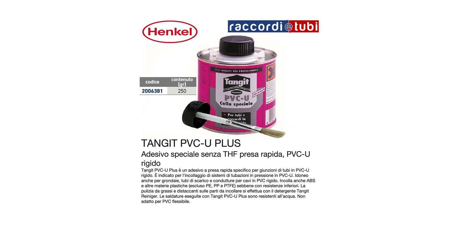 Tangit PVC-U Plus ist ein schnell trocknender Klebstoff, der speziell für Verbindungen von starren PVC-U-Rohren entwickelt wurde. Er eignet sich zum Verkleben von Druckrohrsystemen aus PVC-U. Ebenfalls geeignet für Dachrinnen, Abflussrohre und Leitungen für Kabel aus hartem PVC. Klebt auch ABS und andere Kunststoffe (ausgenommen PE, PP und PTFE), wenn auch mit geringeren Festigkeiten. Die Reinigung von Fetten und Trennmitteln an den zu klebenden Teilen erfolgt mit dem Reiniger Tangit Reiniger. Die Verbindungen, die mit Tangit PVC-U Plus hergestellt werden, sind wasserbeständig. Nicht geeignet für weiches PVC.
