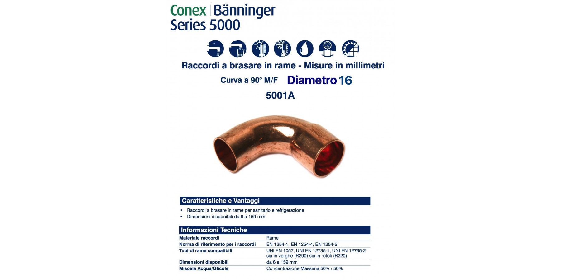 Die Fittings der Serie 5000 werden gemäß UNI EN 1254-1, UNI EN 1254-4 und UNI EN 1254-5 produziert und sind geeignet für Verbindungen mit Kupferrohren gemäß UNI EN 1057, UNI EN 12735-1 und UNI EN 12735-2. Sie eignen sich für den Einsatz in Anlagen zur Versorgung und Verteilung von Kalt- und Warmwasser, Heizung und Kühlung, brennbaren Gasen und Kältemitteln.