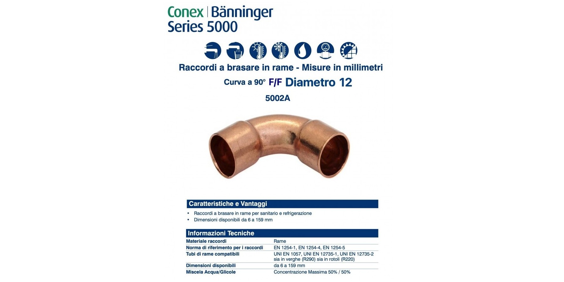 Die Fittings der Serie 5000 werden gemäß UNI EN 1254-1, UNI EN 1254-4 und UNI EN 1254-5 hergestellt und sind geeignet für die Verbindung mit Kupferrohren, die nach UNI EN 1057, UNI EN 12735-1 und UNI EN 12735-2 produziert werden. Sie eignen sich für den Einsatz in Kalt- und Warmwasseranlagen, Heiz- und Kühlsystemen sowie in Anlagen für brennbare Gase und Kältemittel.