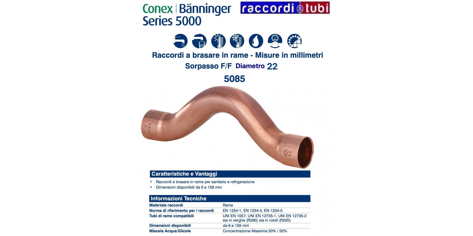 Die Fittings der Serie 5000 werden gemäß UNI EN 1254-1, UNI EN 1254-4 sowie UNI EN 1254-5 hergestellt und eignen sich für Verbindungen mit Kupferrohren, die nach UNI EN 1057, UNI EN 12735-1 und UNI EN 12735-2 gefertigt sind. Geeignet für den Einsatz in Kalt- und Warmwasser-, Heiz- und Kühlsystemen sowie für brennbare Gase und Kältemittel.