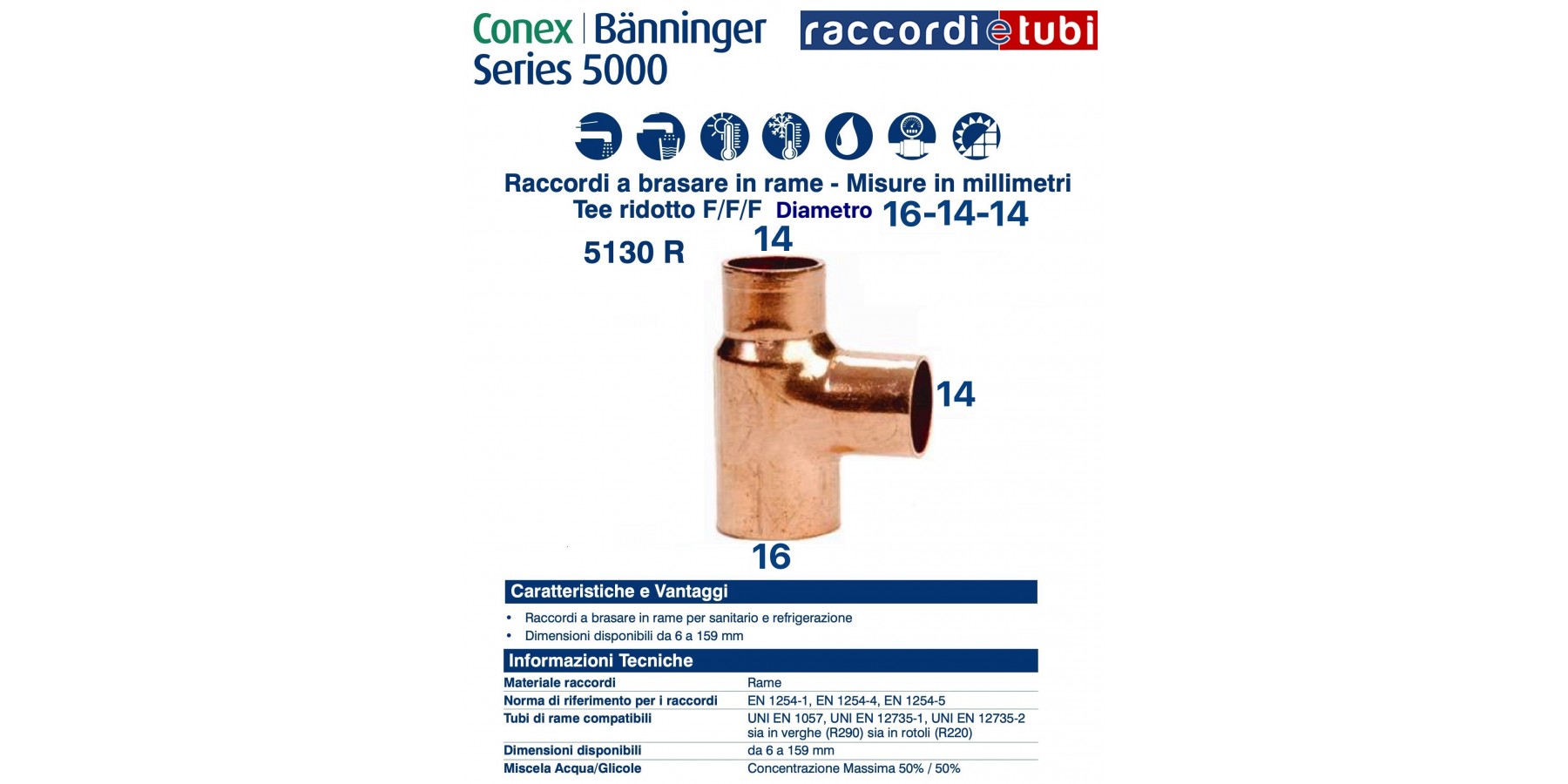 Die Fittings der Serie 5000 werden gemäß UNI EN 1254-1, UNI EN 1254-4 und UNI EN 1254-5 hergestellt und sind geeignet für Verbindungen mit Kupferrohren, produziert nach UNI EN 1057, UNI EN 12735-1 und UNI EN 12735-2. Sie sind geeignet für die Verwendung in Anlagen zur Förderung und Verteilung von Kalt- und Warmwasser, Heizungs- und Kühlanlagen, brennbaren Gasen und Kältemitteln.