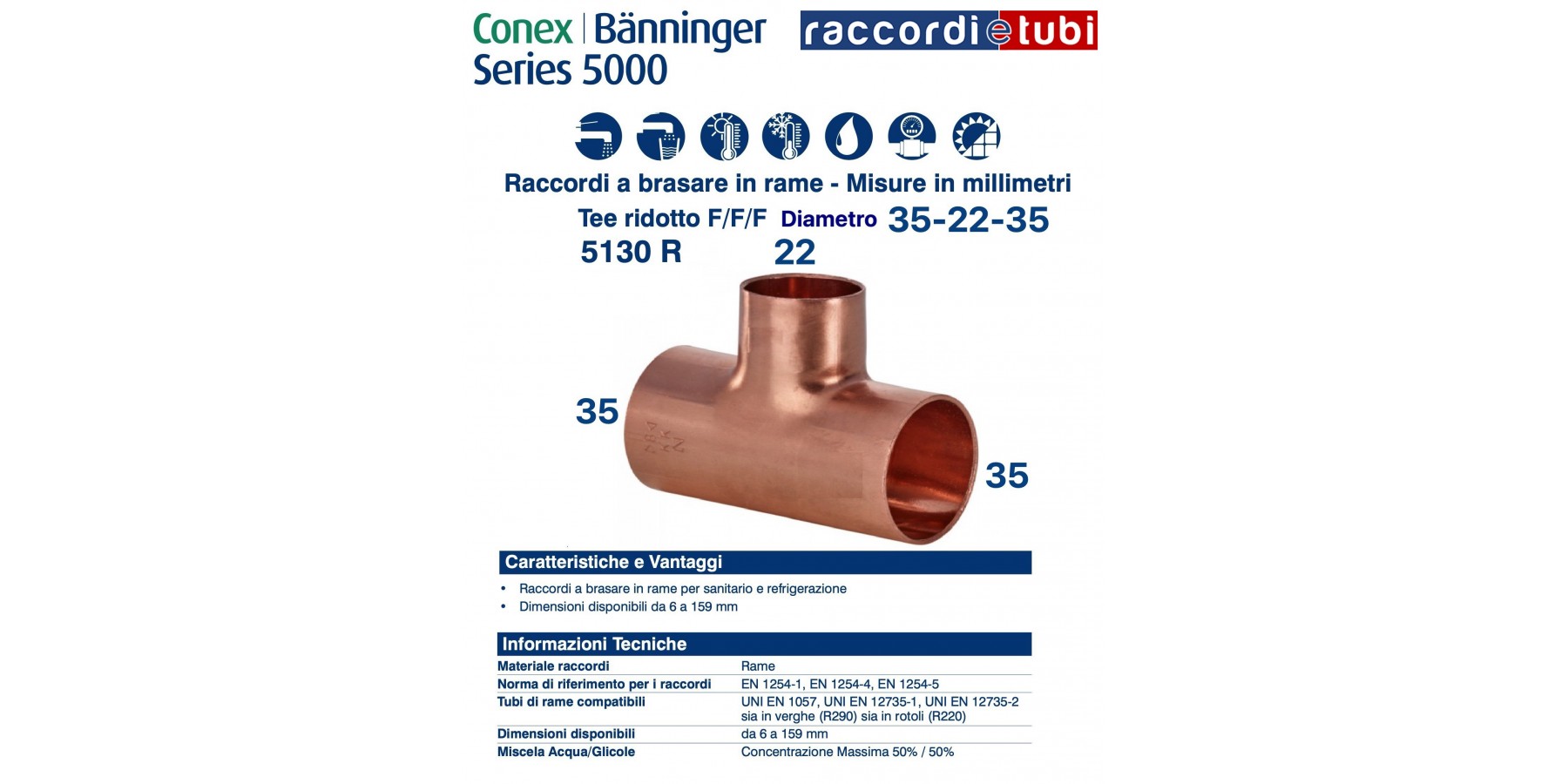 Die Fittings der Serie 5000 werden gemäß UNI EN 1254-1, UNI EN 1254-4 und UNI EN 1254-5 hergestellt und eignen sich zur Verbindung mit Kupferrohren, gefertigt nach UNI EN 1057, UNI EN 12735-1 und UNI EN 12735-2. Sie sind geeignet für den Einsatz in Kalt- und Warmwasser-, Heizungs- und Kühlsystemen sowie in Gas- und Kältemittelanlagen.