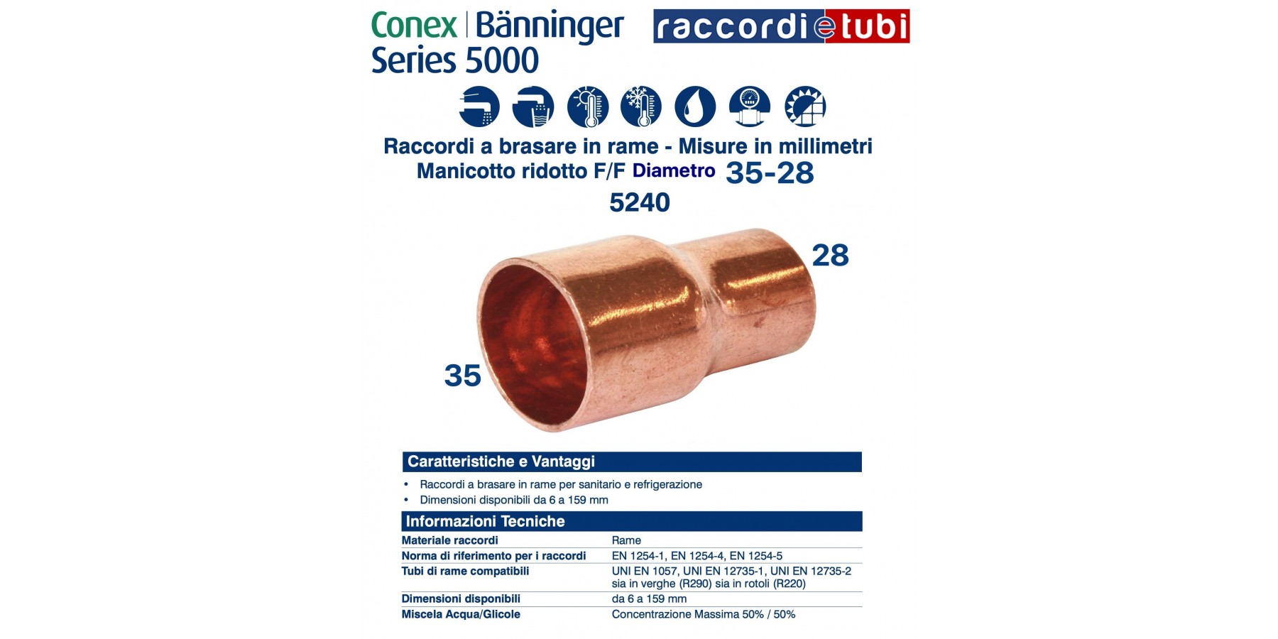 Die Fittings der Serie 5000 werden gemäß UNI EN 1254-1, UNI EN 1254-4 und UNI EN 1254-5 hergestellt und sind für die Verbindung mit Kupferrohren nach UNI EN 1057, UNI EN 12735-1 und UNI EN 12735-2 geeignet. Sie eignen sich für die Verwendung in Kalt- und Warmwasserversorgungsanlagen, Heizungs- und Kühlsystemen sowie für brennbare Gase und Kältemittel.