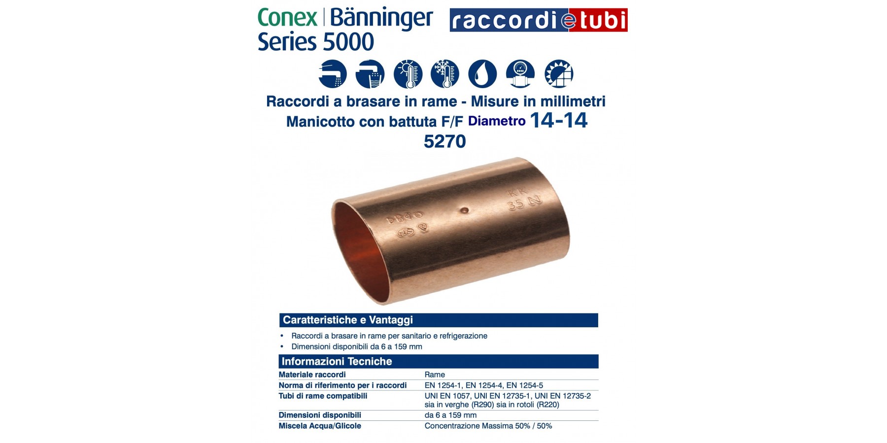 Die Fittings der Serie 5000 werden gemäß UNI EN 1254-1, UNI EN 1254-4 und UNI EN 1254-5 hergestellt und sind geeignet für Verbindungen mit Kupferrohren, die nach UNI EN 1057, UNI EN 12735-1 und UNI EN 12735-2 produziert werden. Sie sind geeignet für den Einsatz in Kalt- und Warmwasserversorgungssystemen, Heizungs- und Kühlanlagen sowie für brennbare Gase und Kältemittel.
